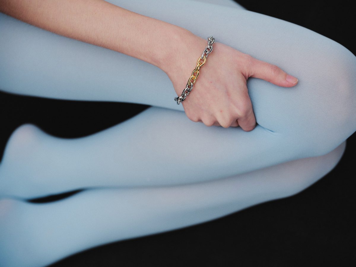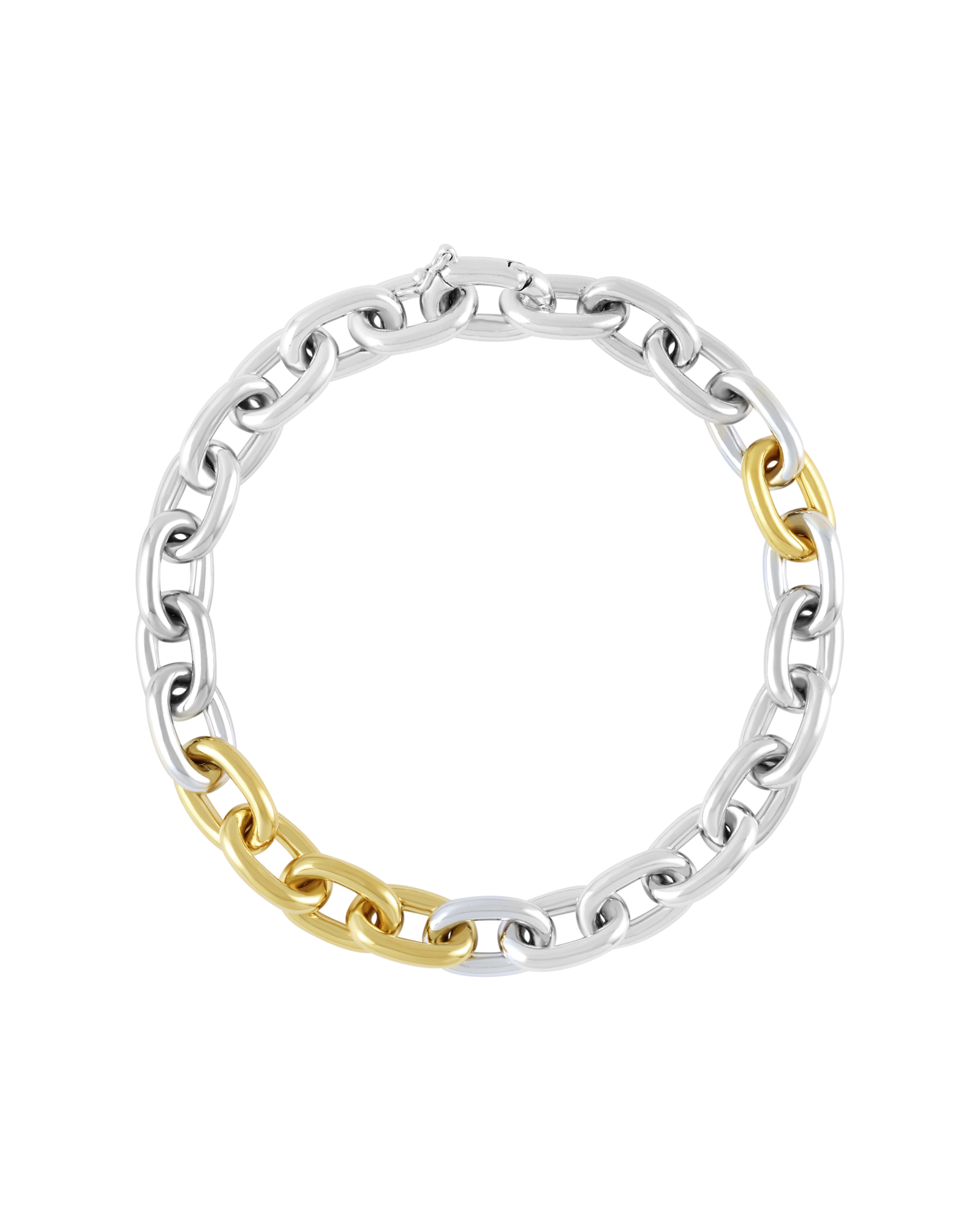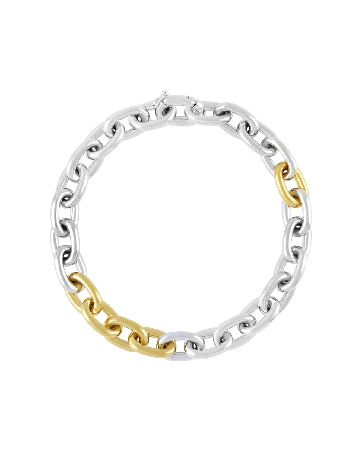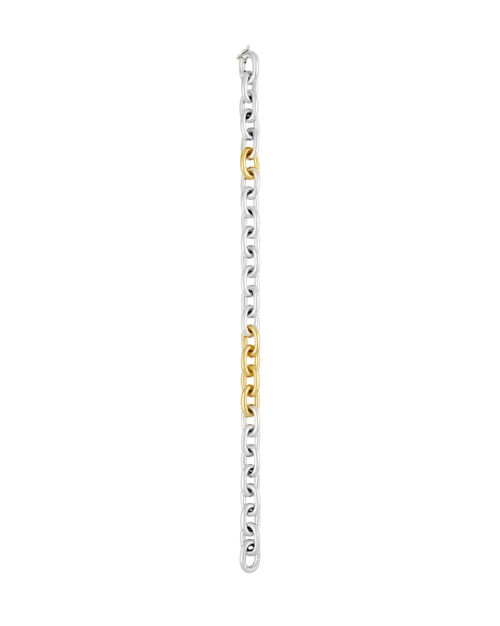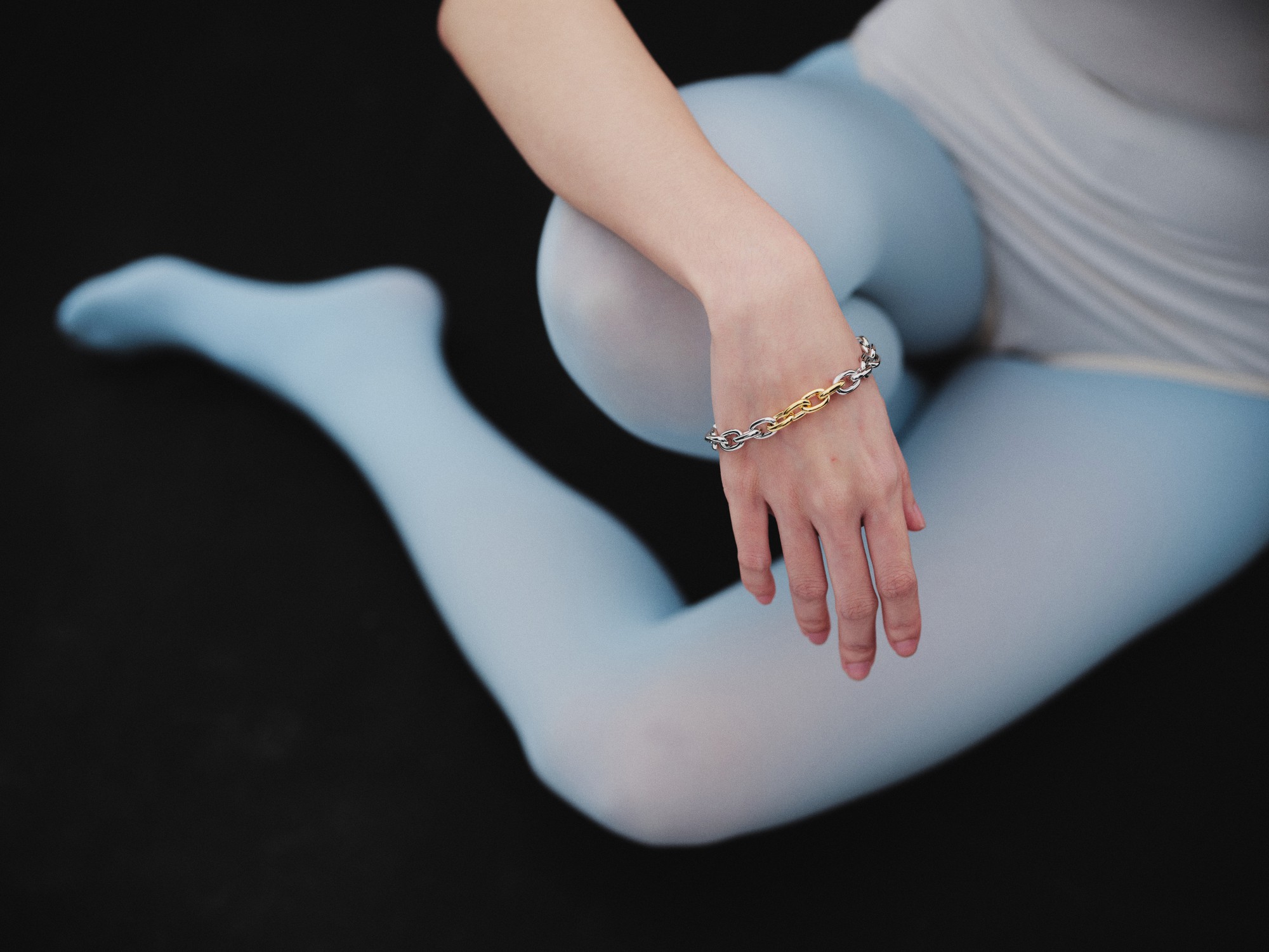 The Benja Seamless Link Bracelet is an expansion of our Seamless series. The word Benja means “five” in Thai, which reflects the design of the piece: a silver rounded chunky links bracelet with five gold-colored links. One gold link is set apart from the remaining four — a deliberate touch that gives a sense of rhythm and motion into the seamless cycle of the chain.