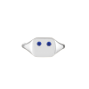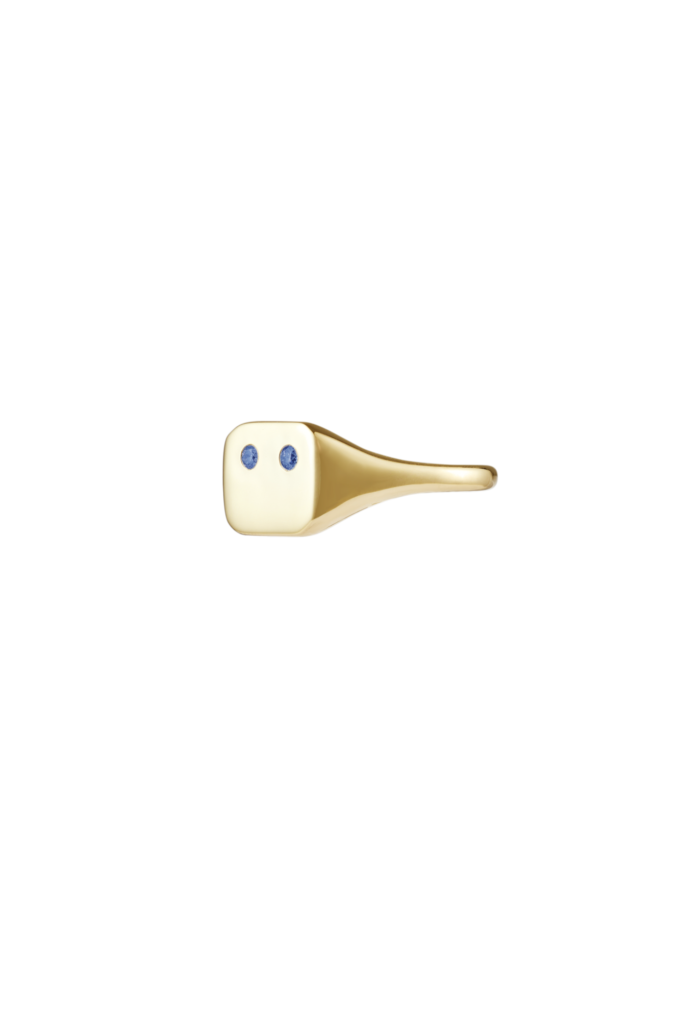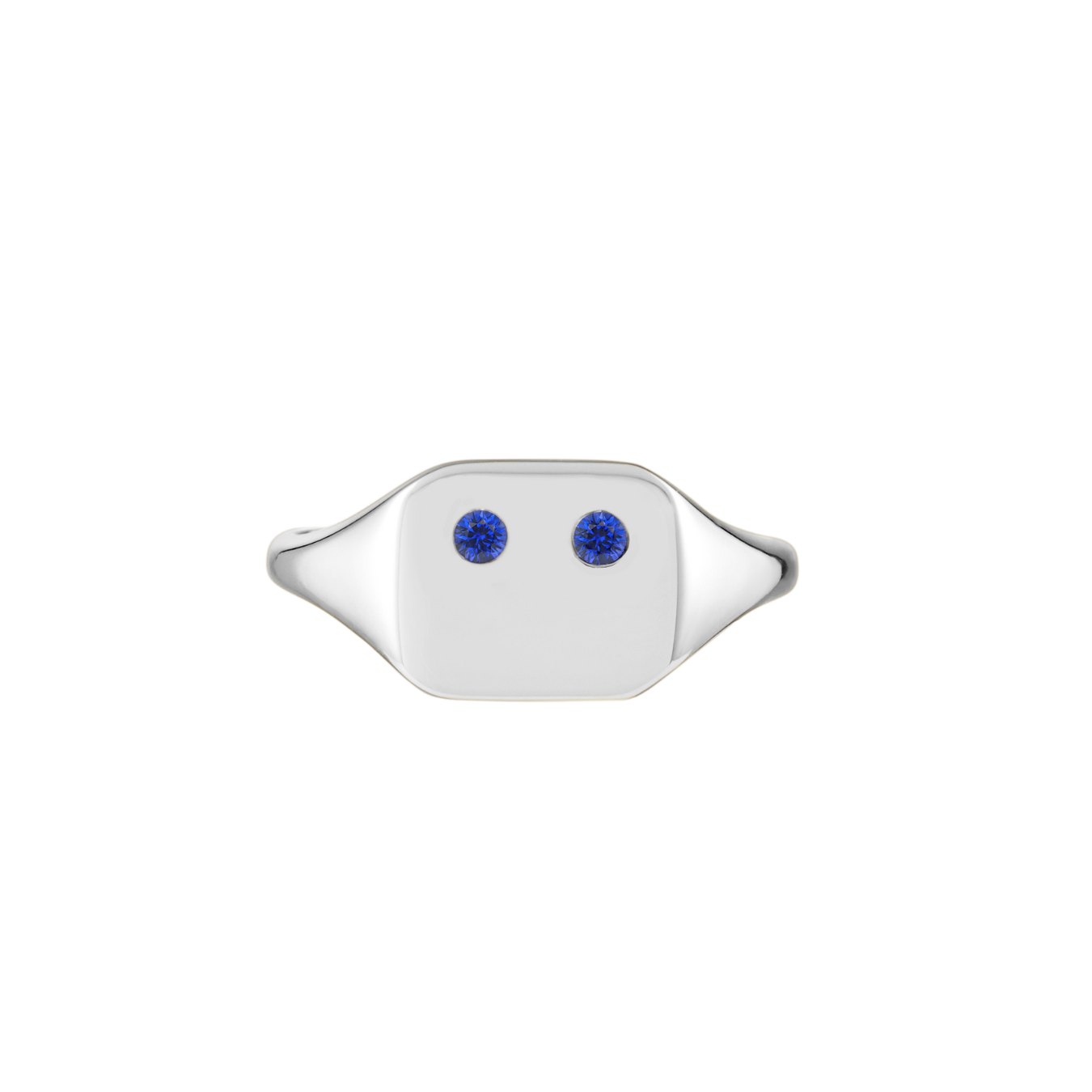 Beautiful everyday signet ring with beveled edges and face set with twin blue sapphires, resembling the “eyes” of a minimalist emoji. Purposefully left without a mouth, the face becomes a blank canvas, allowing the wearer to define their mood each day.