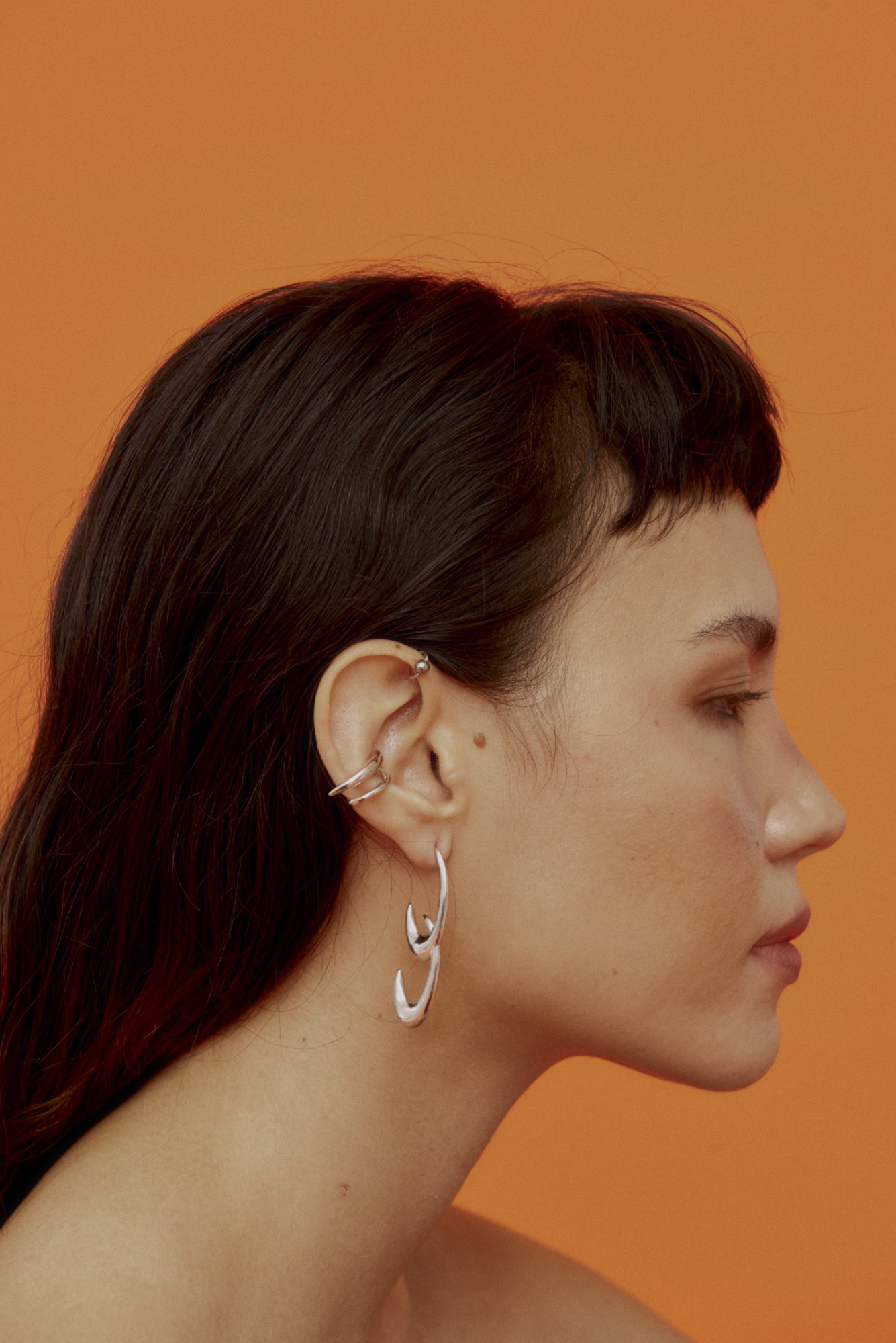 Garintr (meaning “elephant” in Thai) earrings with overlapping tusks. An homage to our national animal from our Tusk series, originally launched in May 2020. Available as singles or pairs.