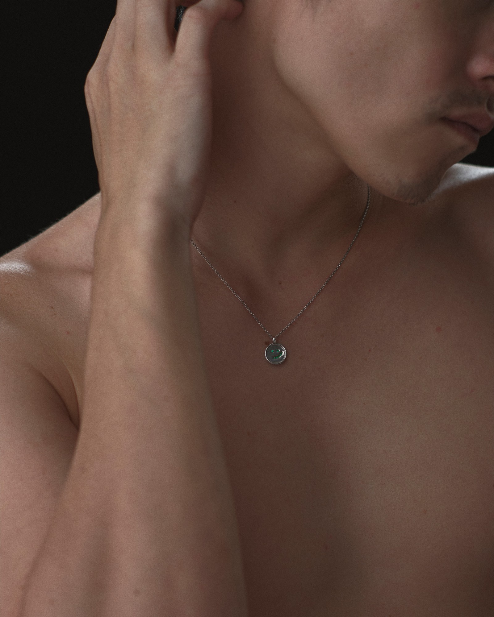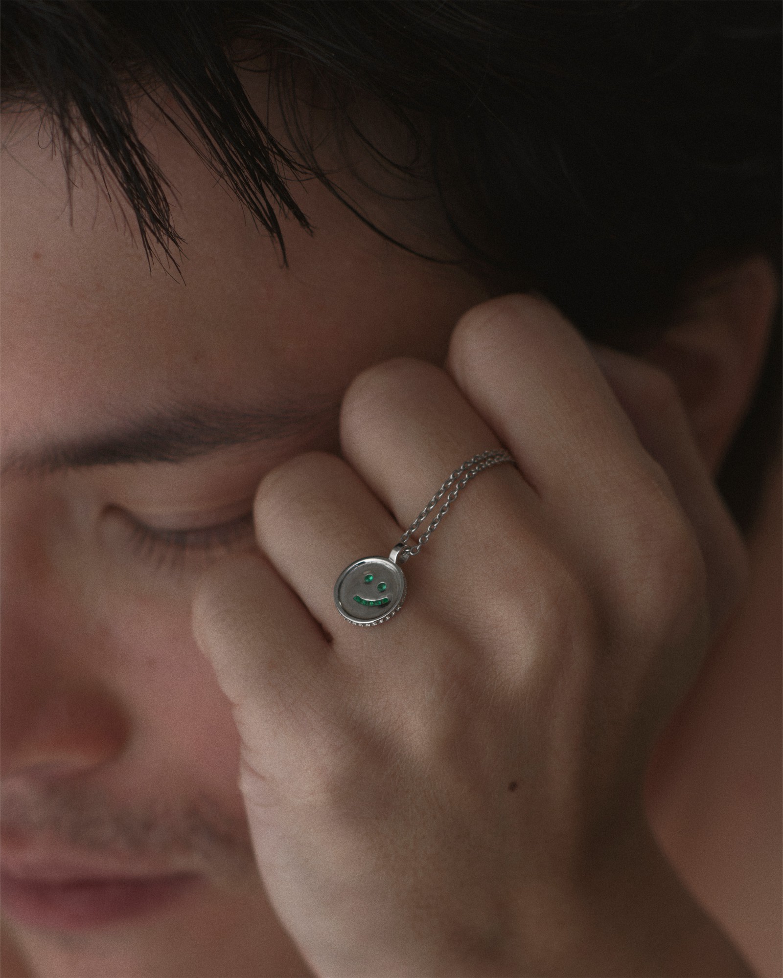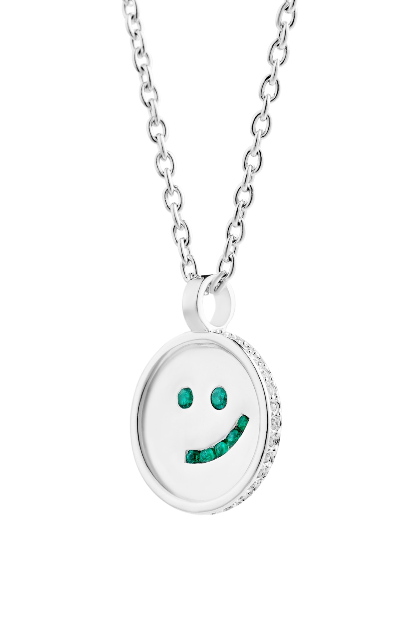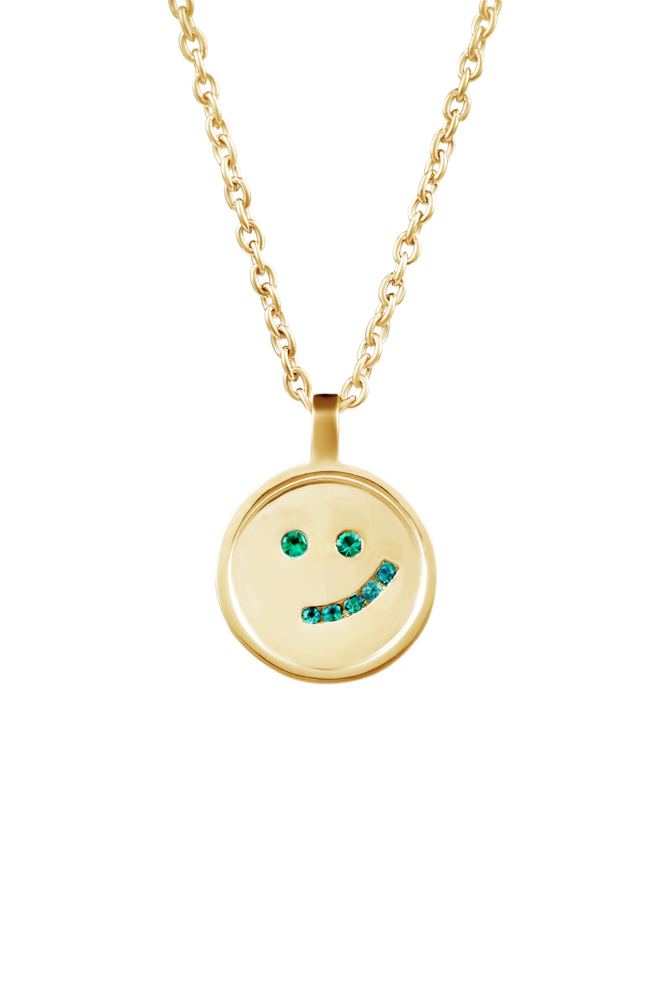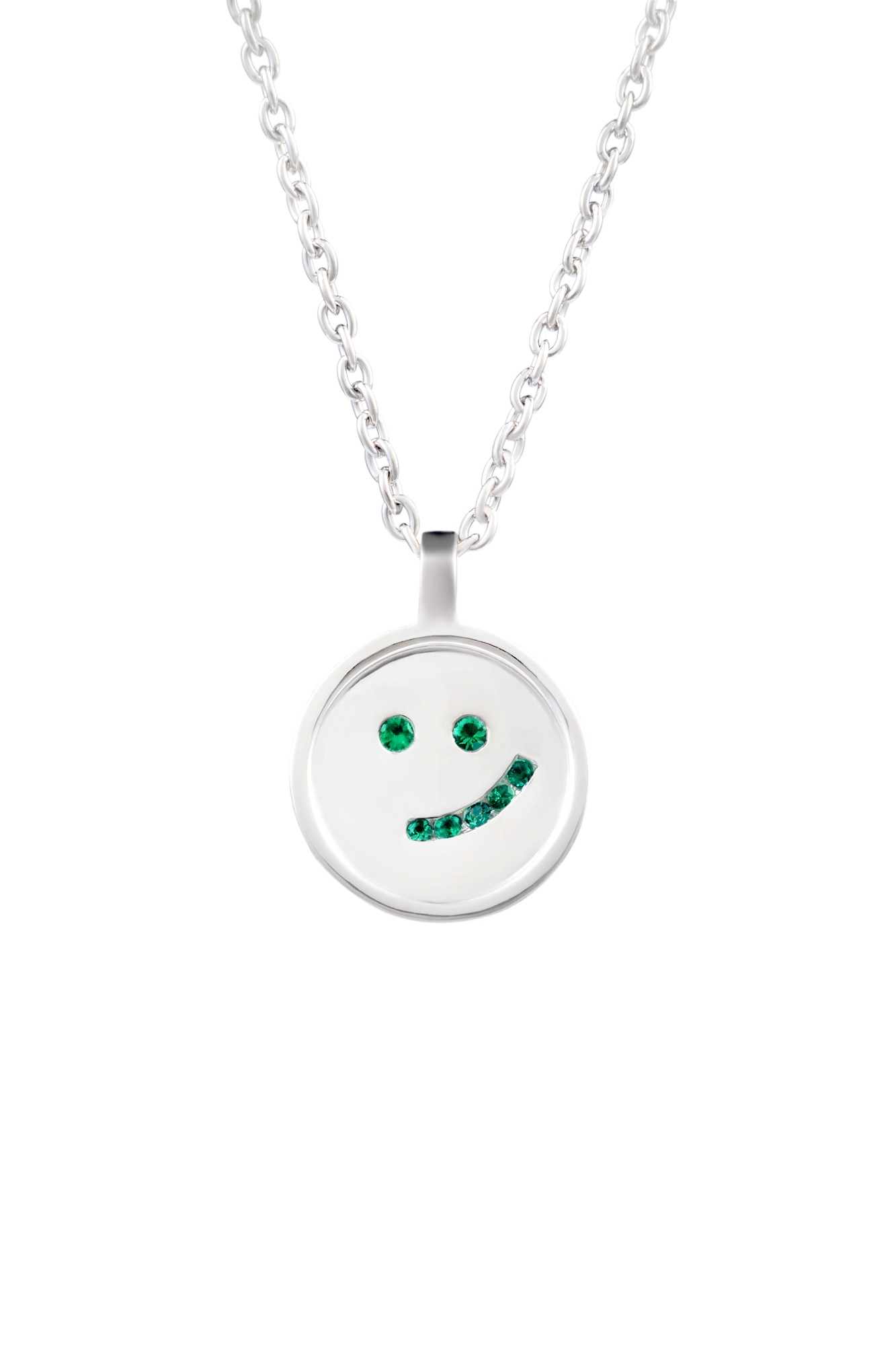 In Thai, “Yim” means “smile.” This fun necklace features emeralds for the smiley face on a circular pendant. Gemstones may vary in color.