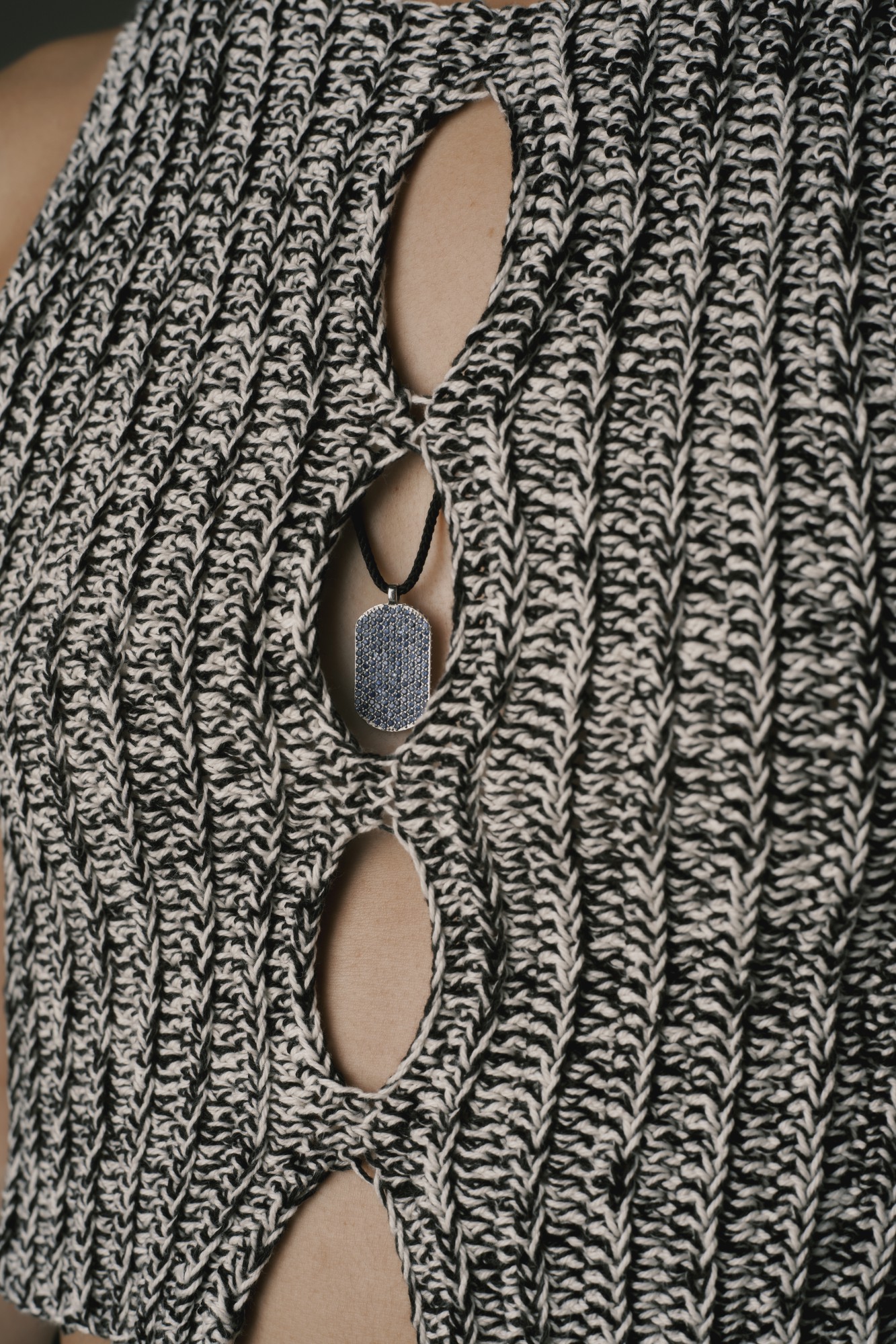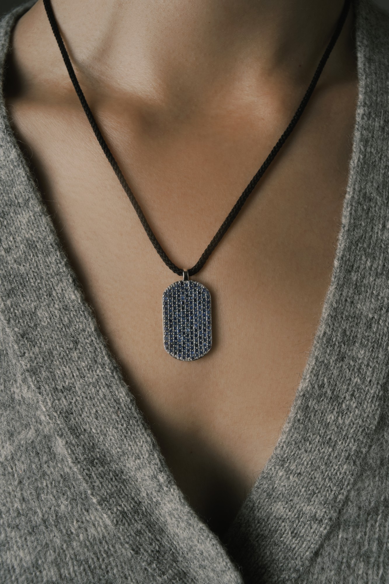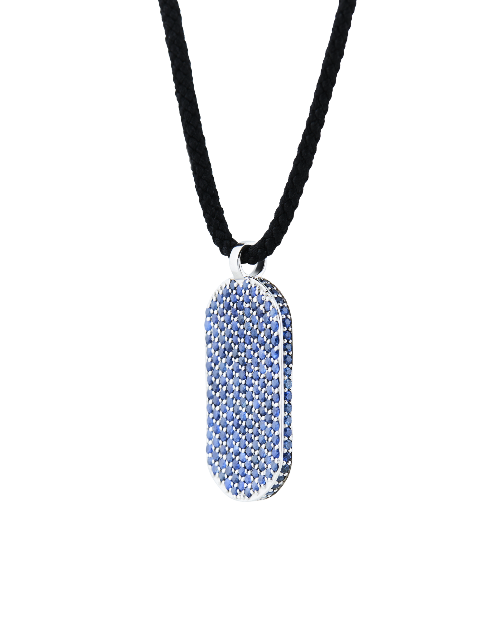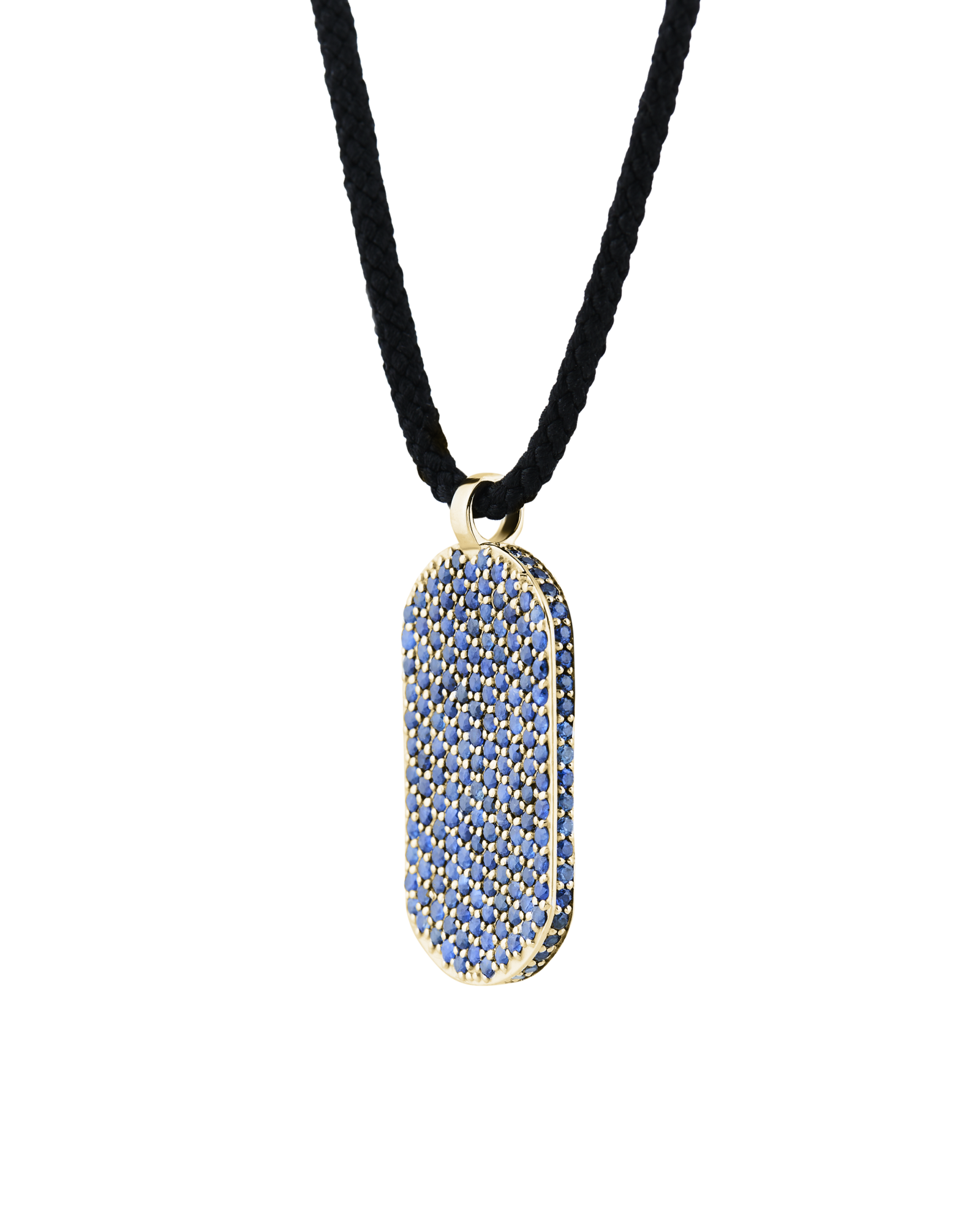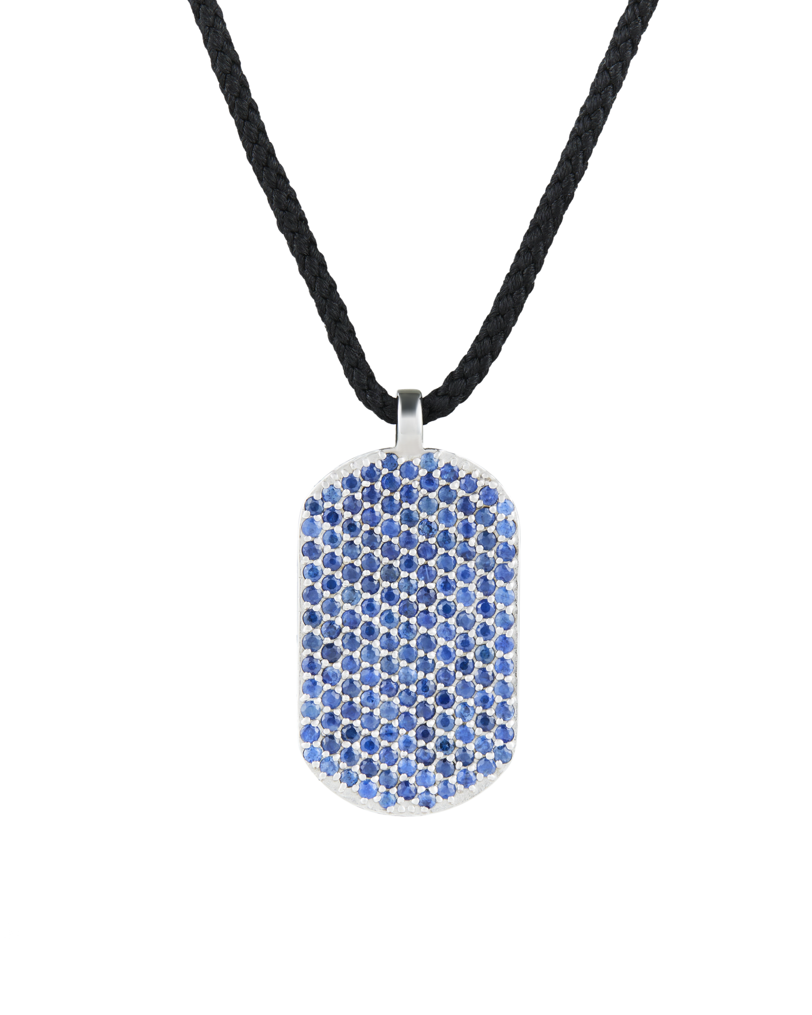 Our signature ID pendant is set with blue sapphires on the front and around the pendant. Paired with black Japanese silk cord to create this ultimate laidback luxurious necklace. Kindly note that necklace lengths can vary slightly.