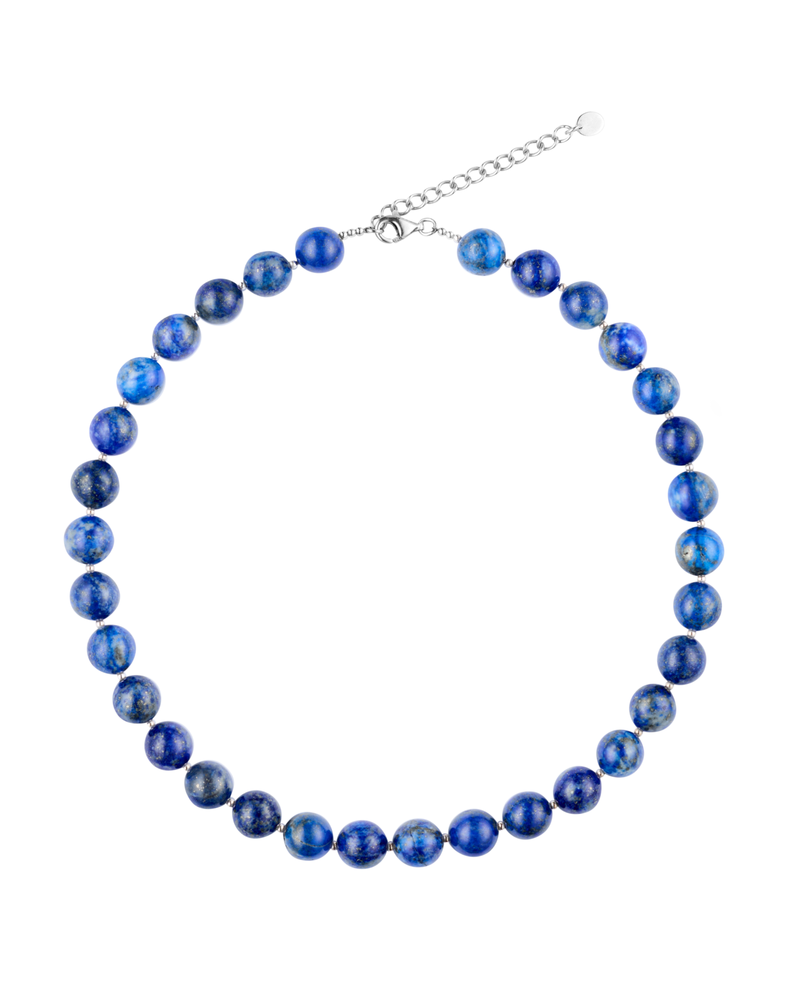 This Meen Necklace features classic beaded pieces for a minimal and effortlessly chic look, and is made from a rhodium plated sterling silver beaded with 10MM lapis lazuli stones. Each stones are natural stone beads and may have some variations in color and shapes.