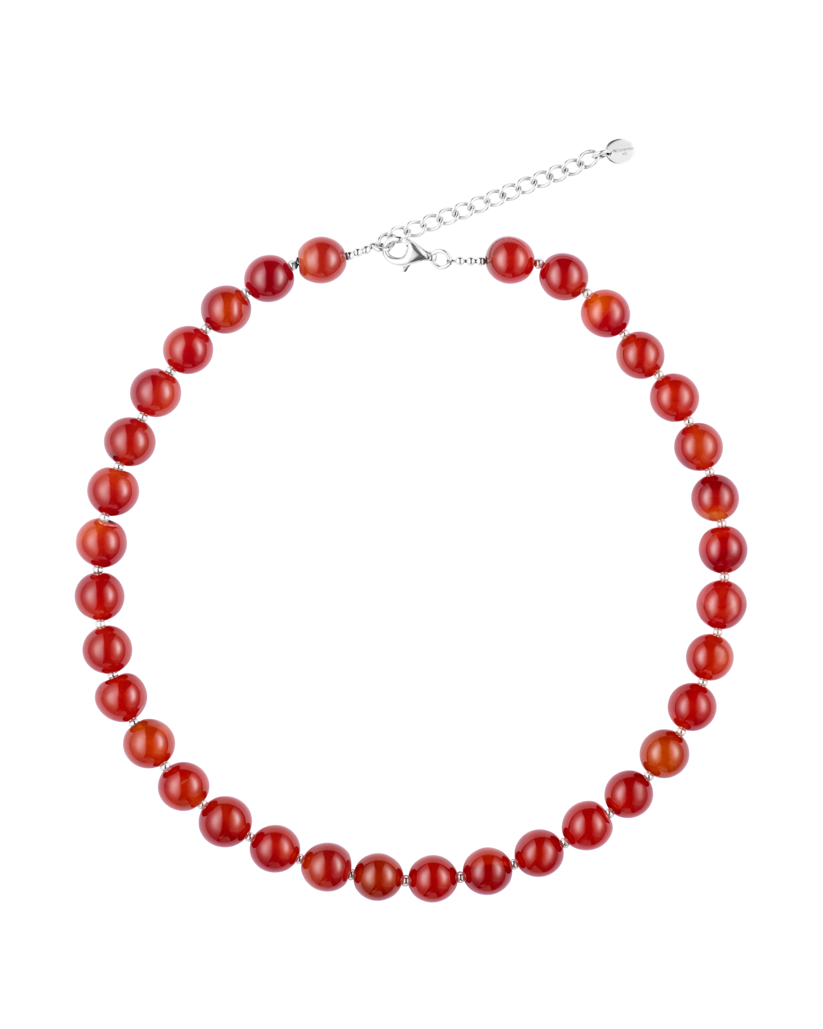 This Meen Necklace features classic beaded pieces for a minimal and effortlessly chic look, and is made from a rhodium plated sterling silver beaded with 10MM red agate stones. Each stones are natural stone beads and may have some variations in color and shapes.