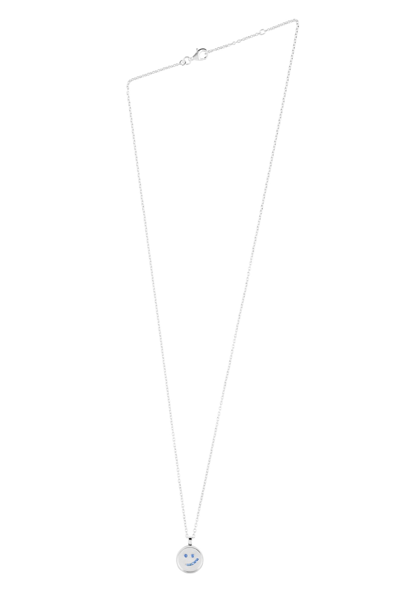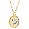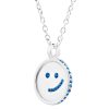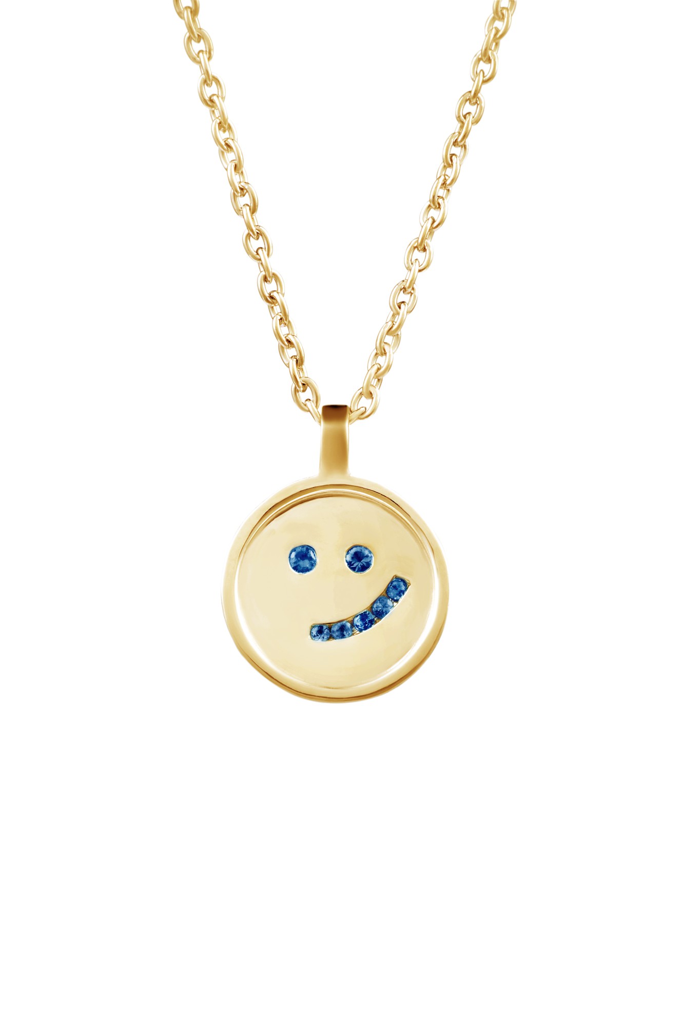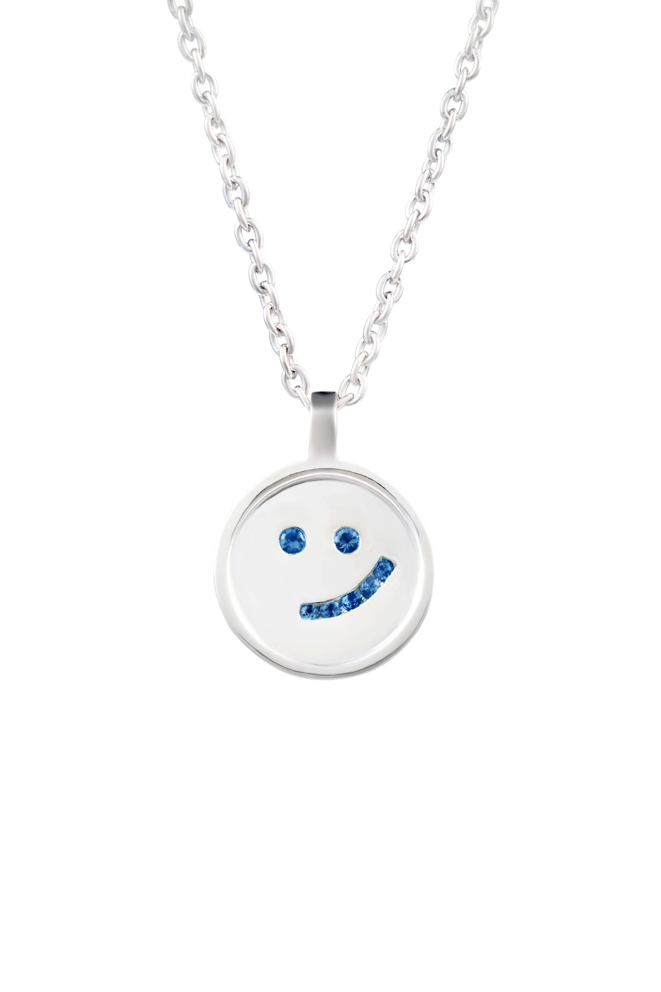 In Thai, “Yim” means “smile.” This fun necklace features blue sapphires placed in a smiley face and around the sides of a circular pendant. Gemstones may vary in color.