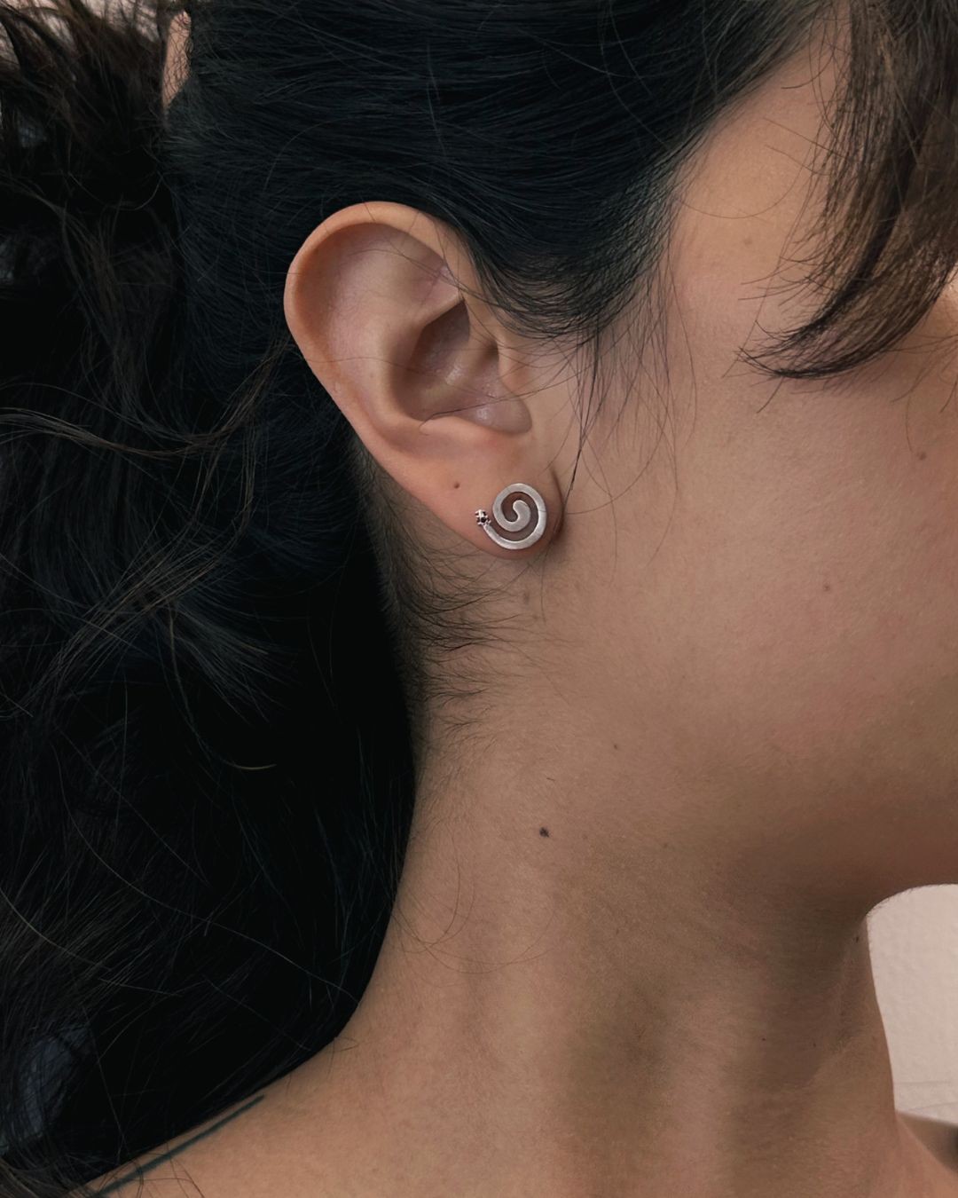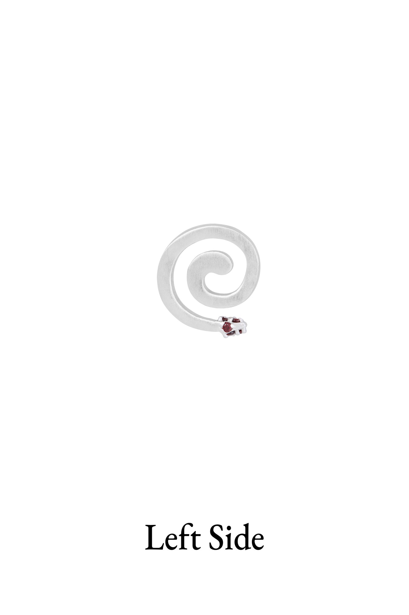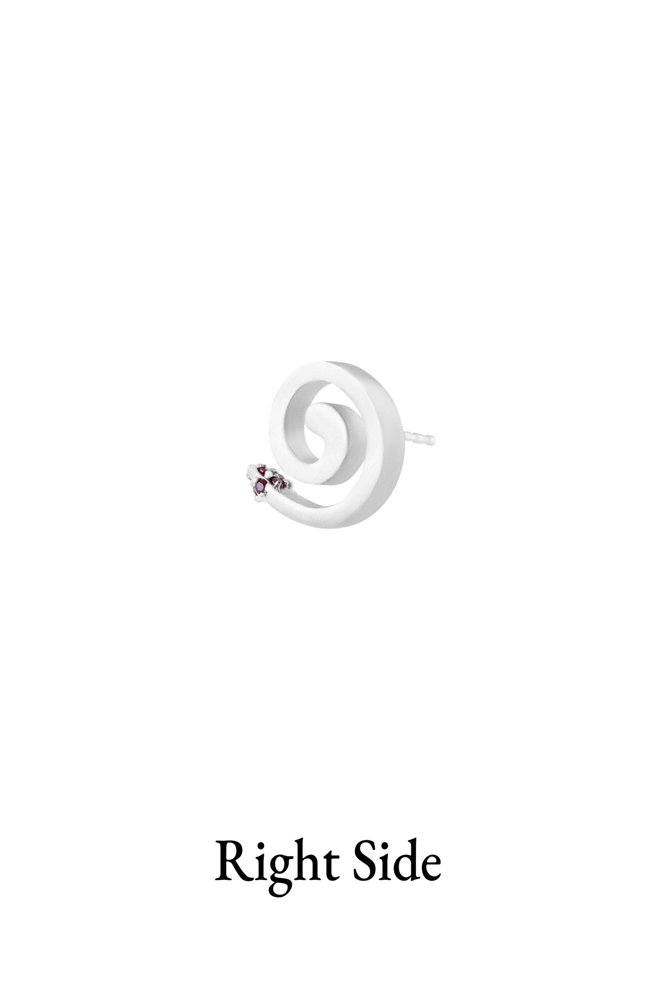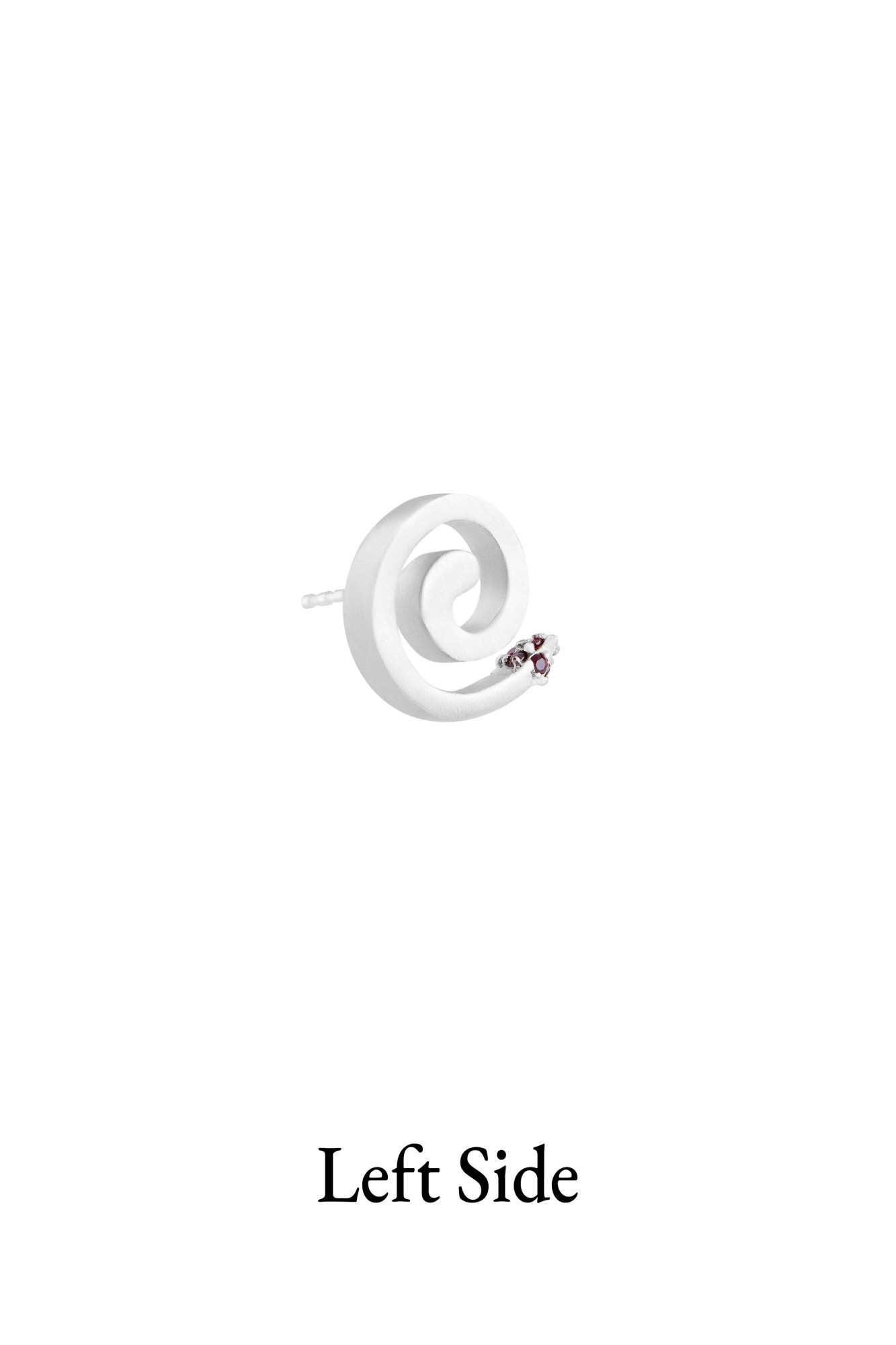 The Pavé Mini Repeller II Earrings combine a compact scale with the added detail of pavé-set red garnets. In this “mini” size, the spiral is reduced in size while retaining its fluid curve, with stones introducing a subtle interplay of light along the matte surface.