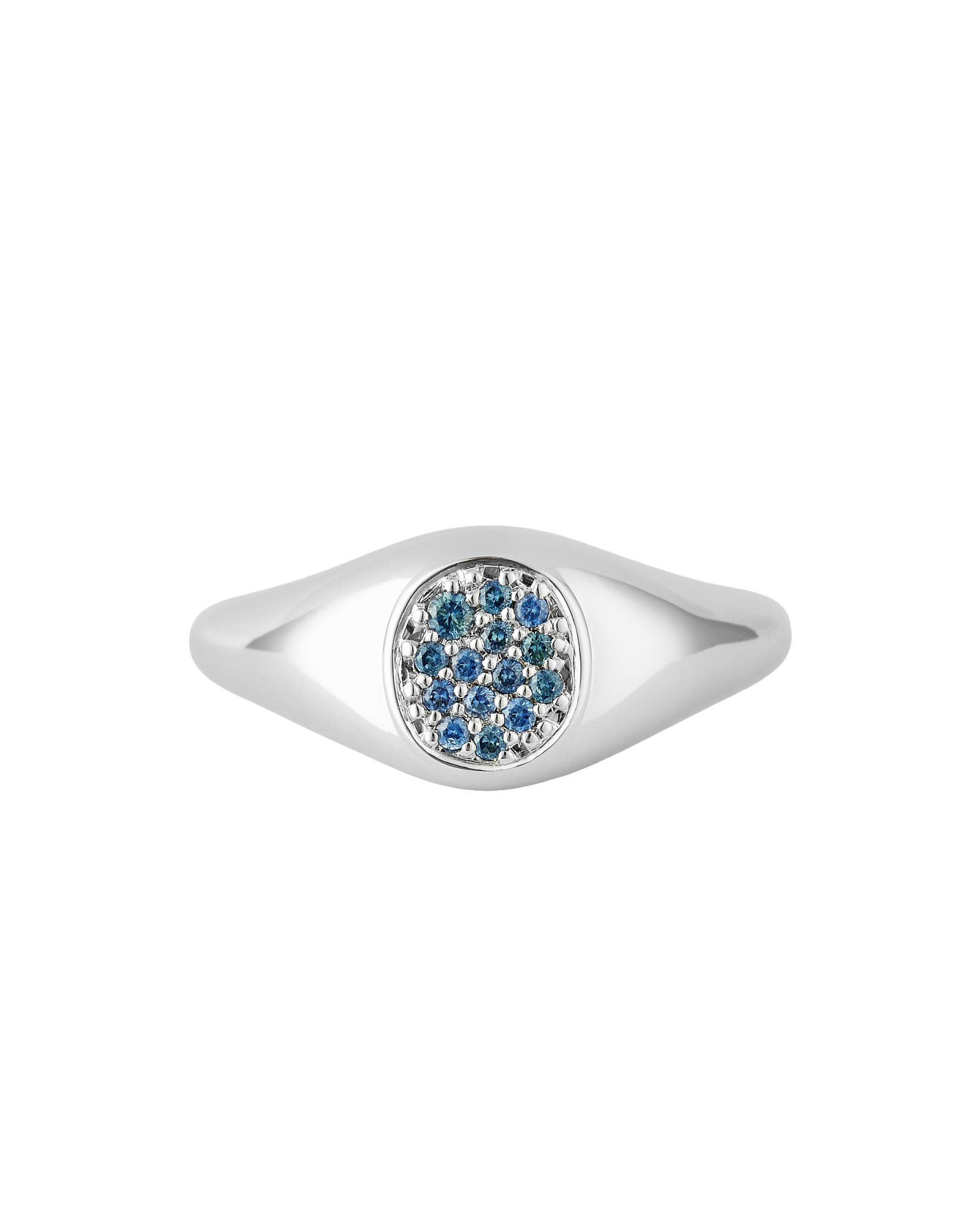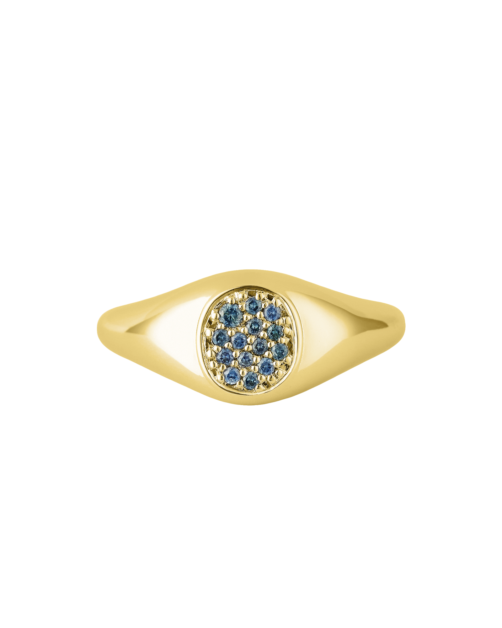 Our signature Impact Signet Ring with blue sapphires set in a pavé setting in the center. Gemstones may vary in color.