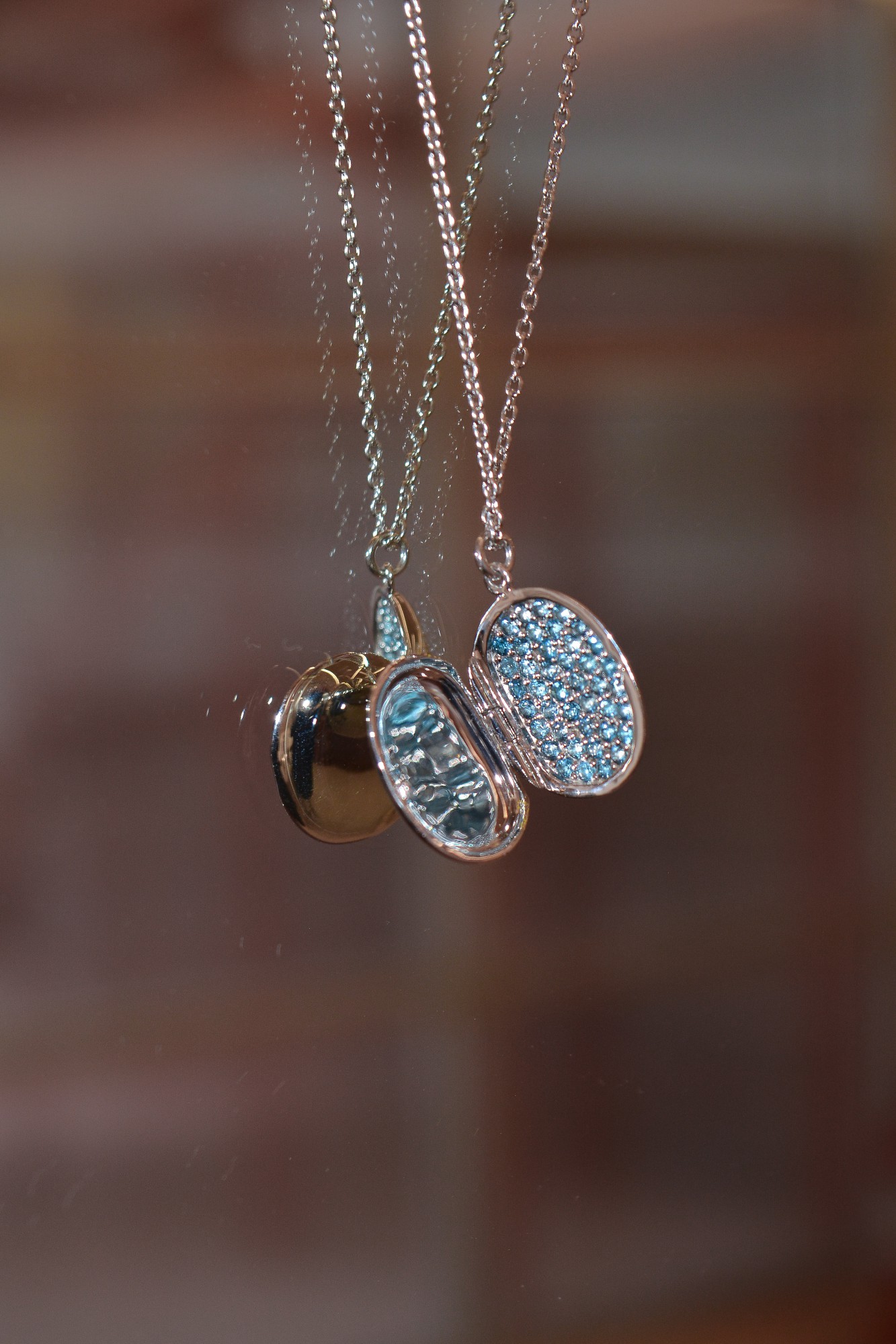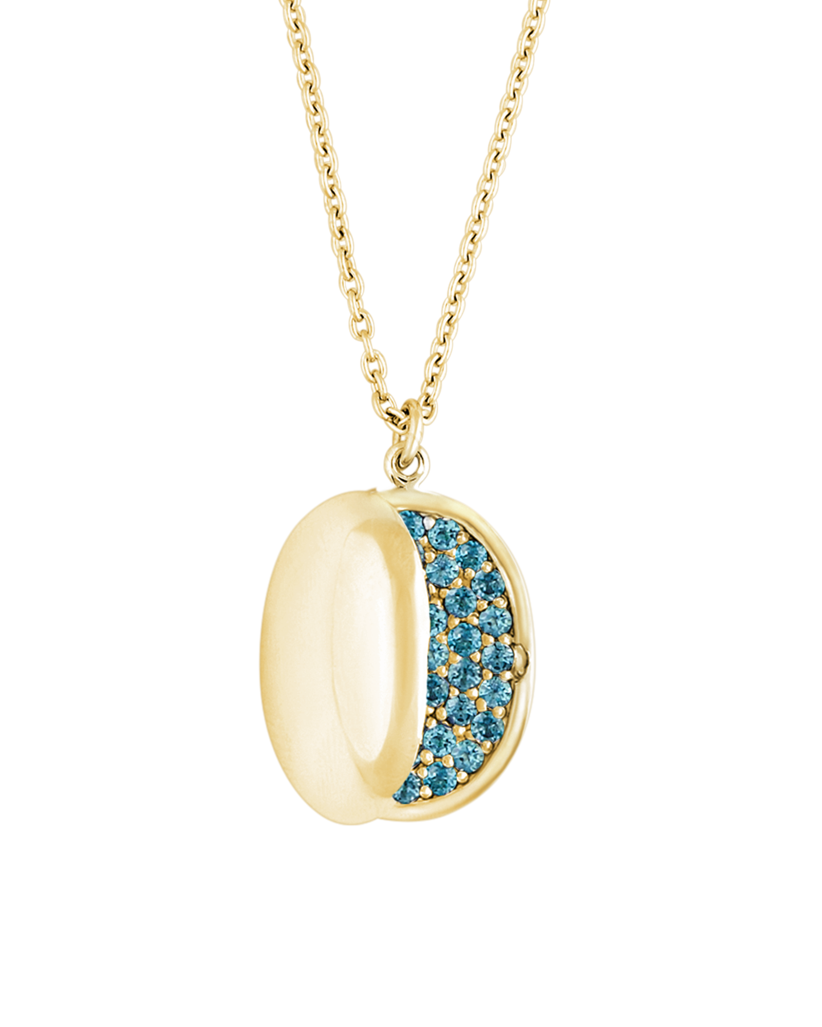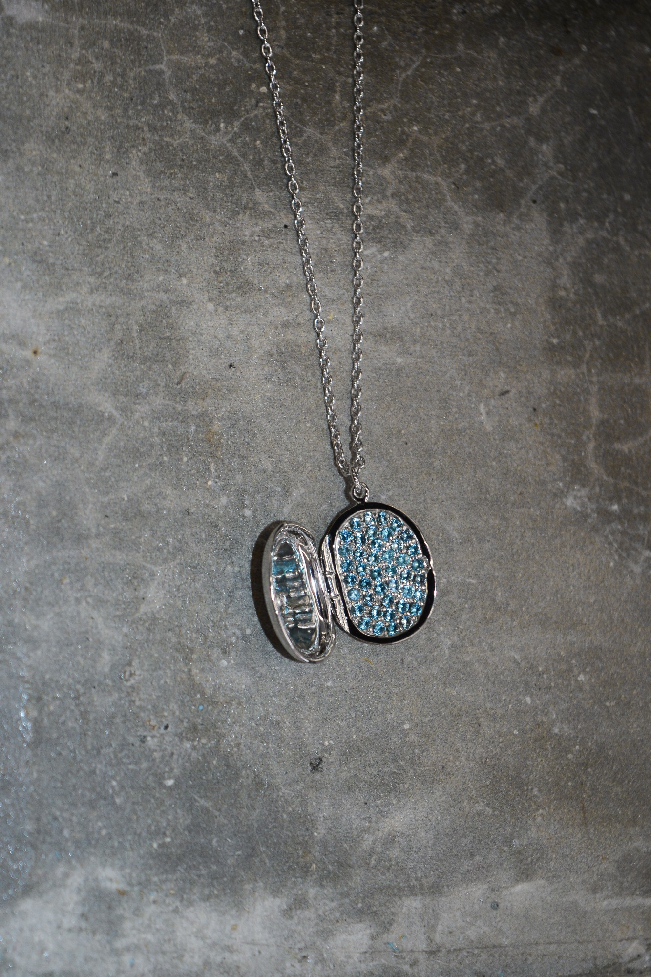 In Thai, “Pritsana” means “mystery.” Named after Pattaraphan’s favorite Thai novel, this conceptual necklace features a full pavé of London Blue Topaz inside the locket. Gemstones may vary in color.