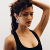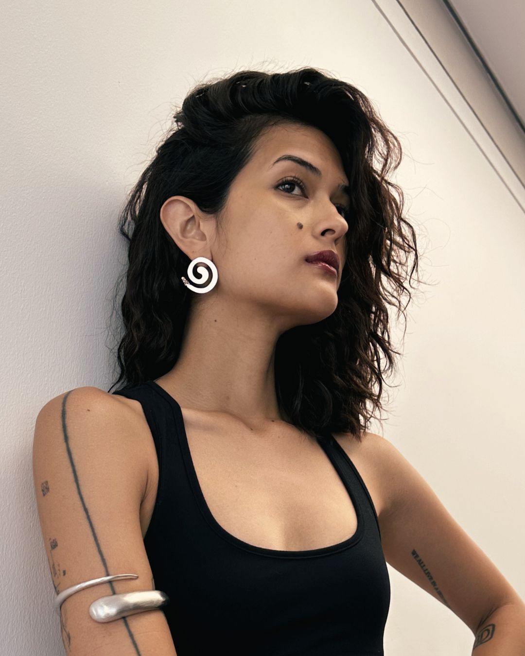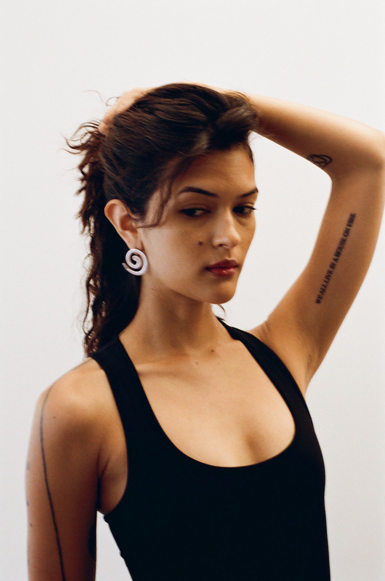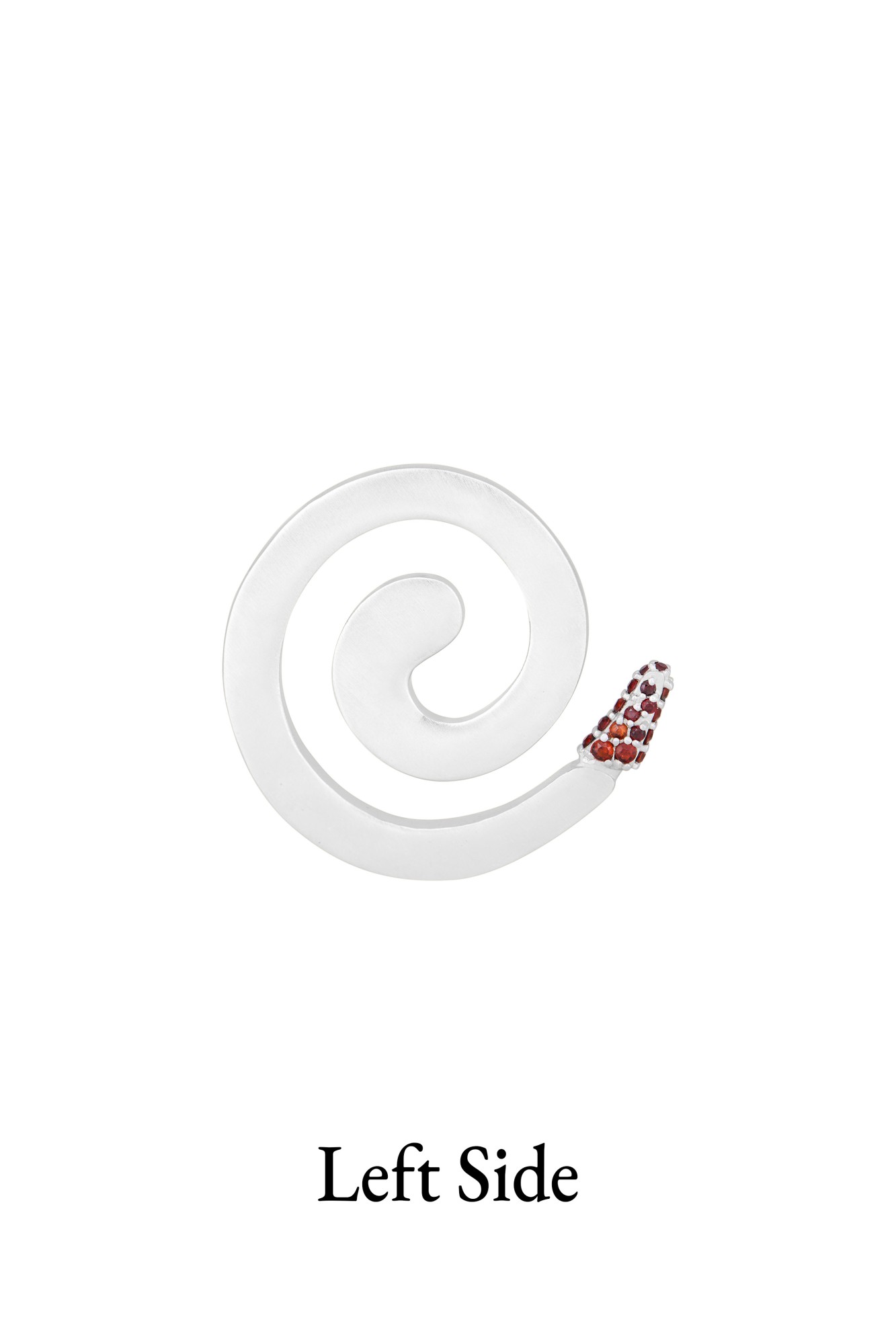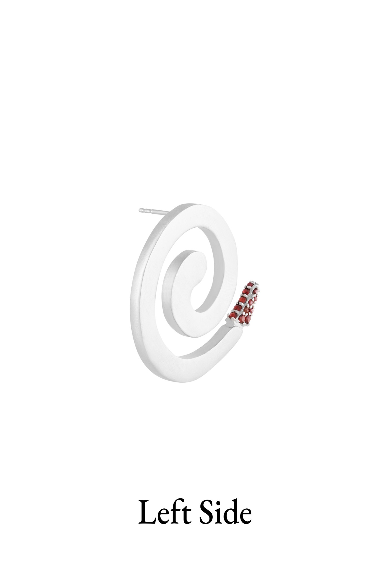The Pavé Repeller II Earrings build on the original spiral form, introducing a section of pavé-set red garnet along the curve.