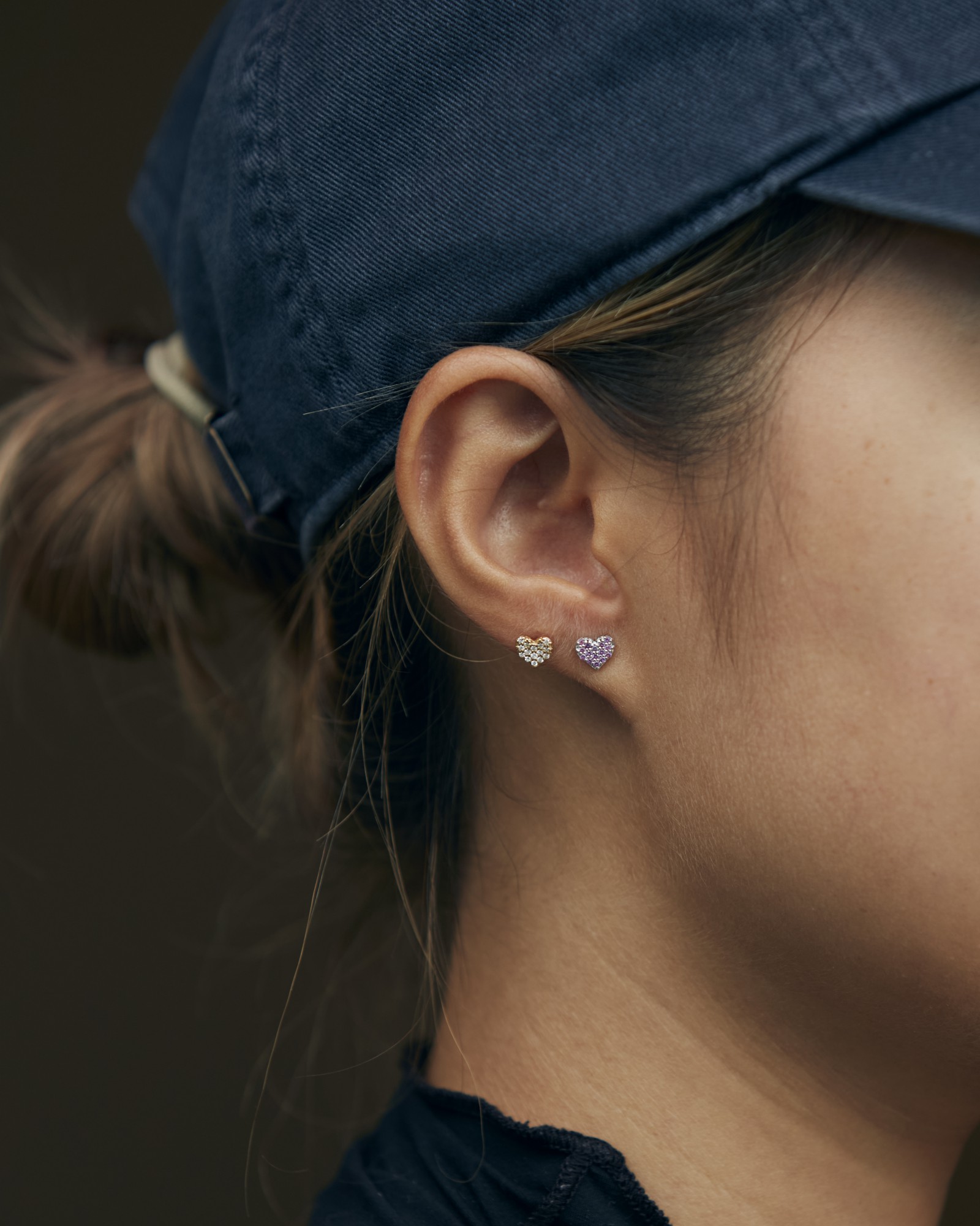 Super tiny and cute. Our heart shaped studs feature white topaz.