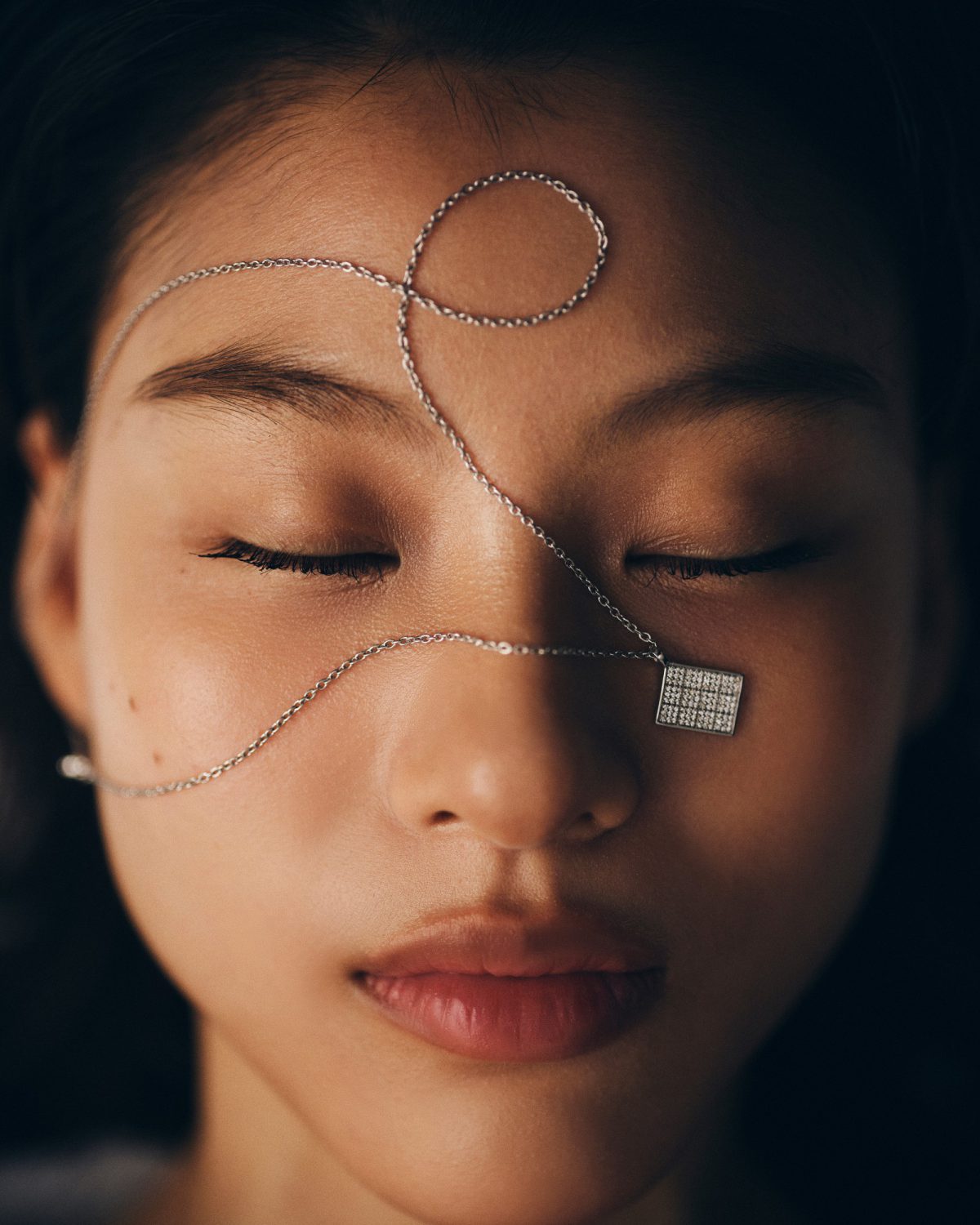 Our classic ID necklace tilted slightly off-center, creating a sense of movement and an asymmetrical touch. Fully pavé-set with diamonds, the piece reflects the connection of the design to the identity of the sun and in its name, Ray.