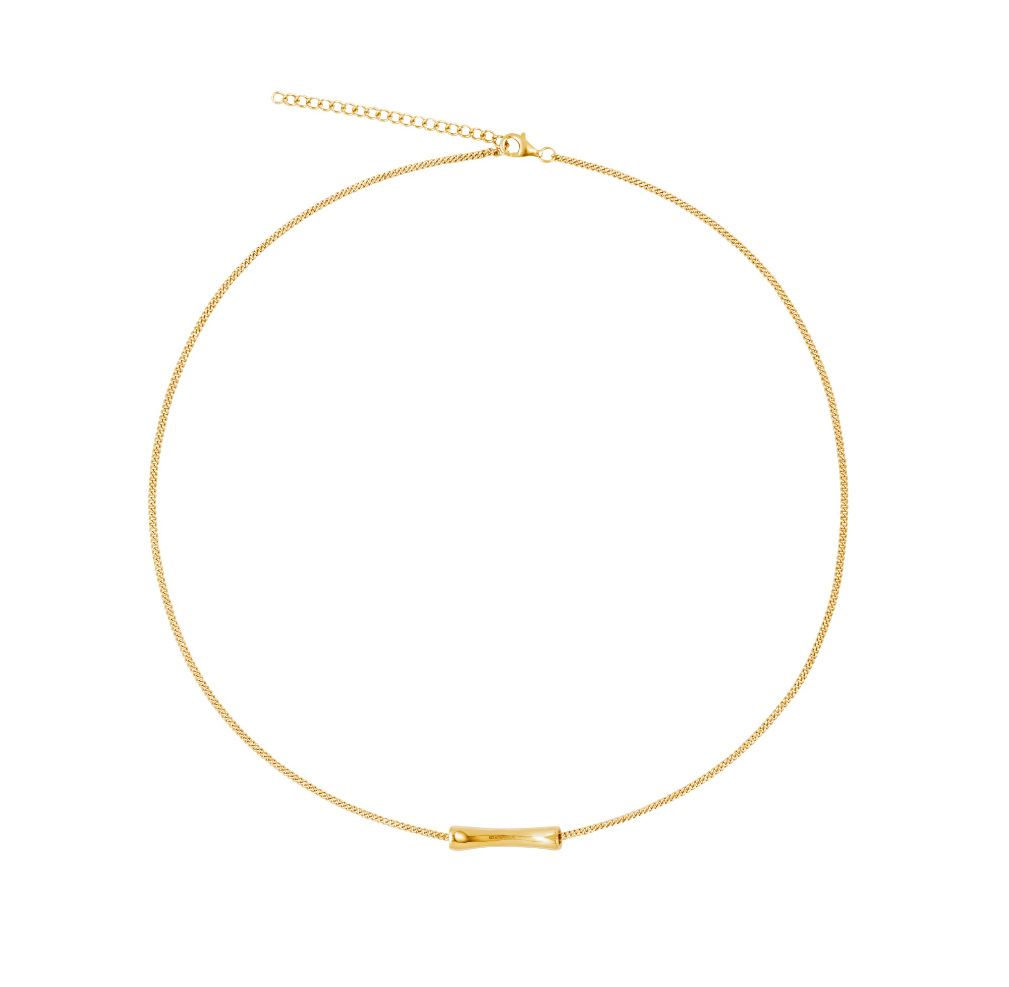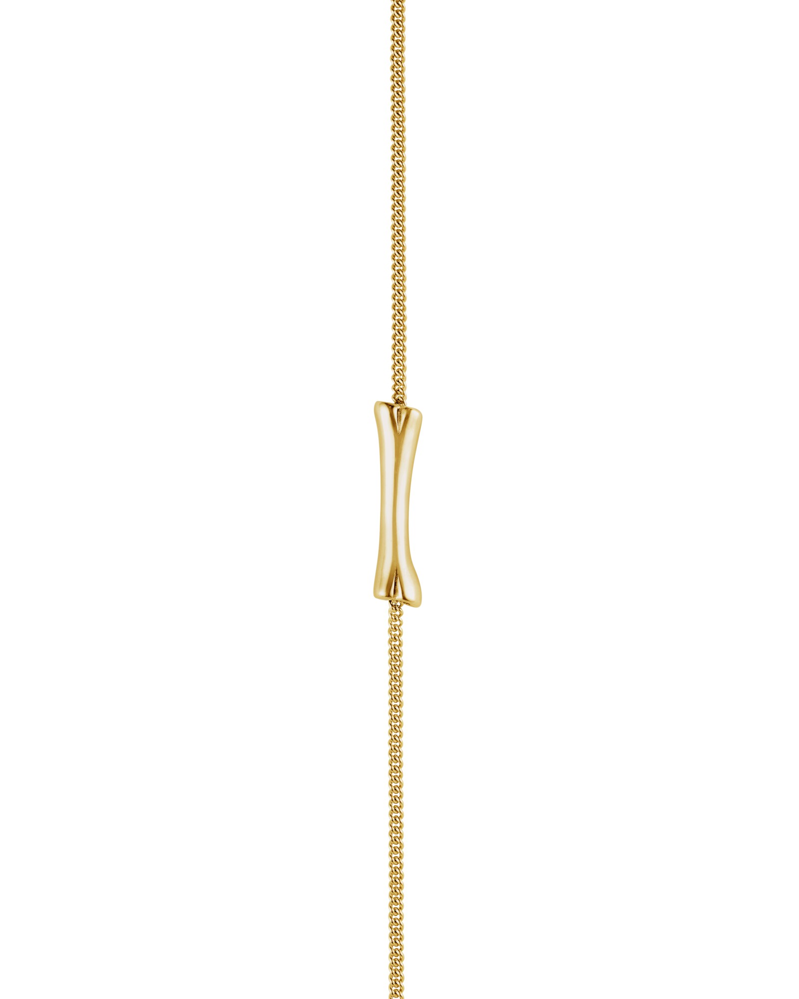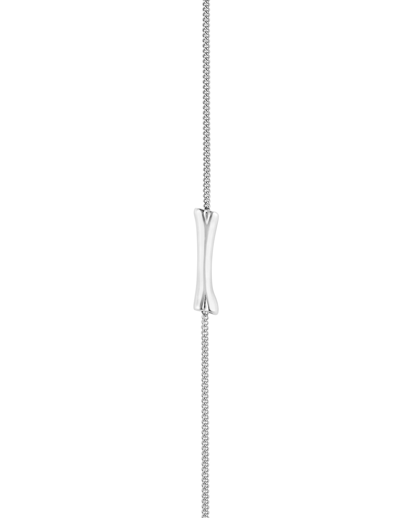 A single handcrafted bone-shaped pendant that is horizontally positioned and threaded through a fine curb chain, remaining free to swing gently with movement.