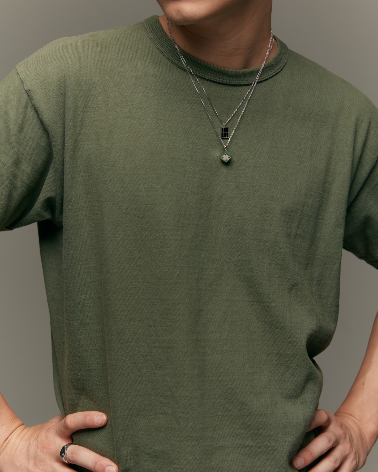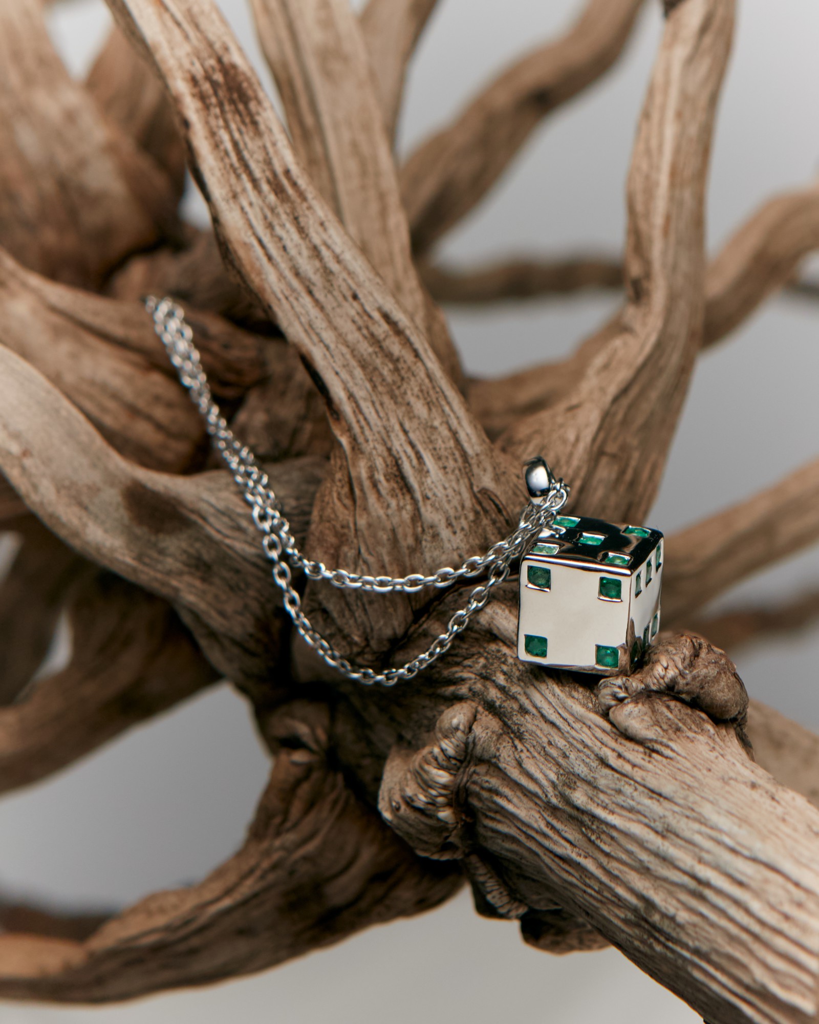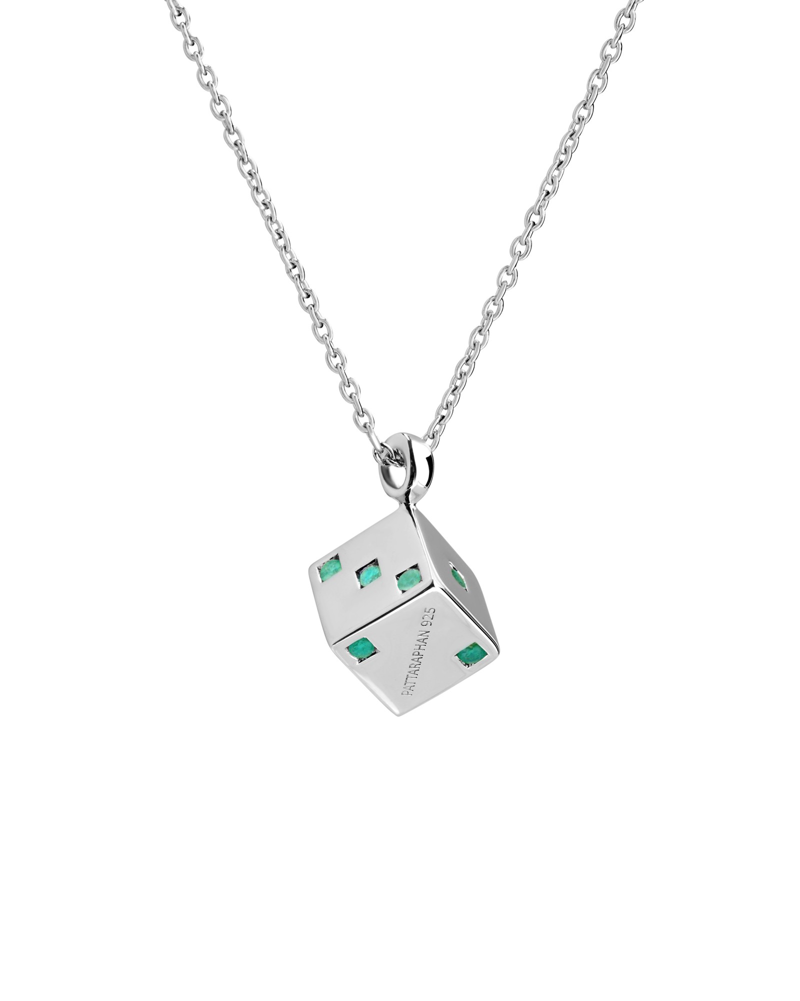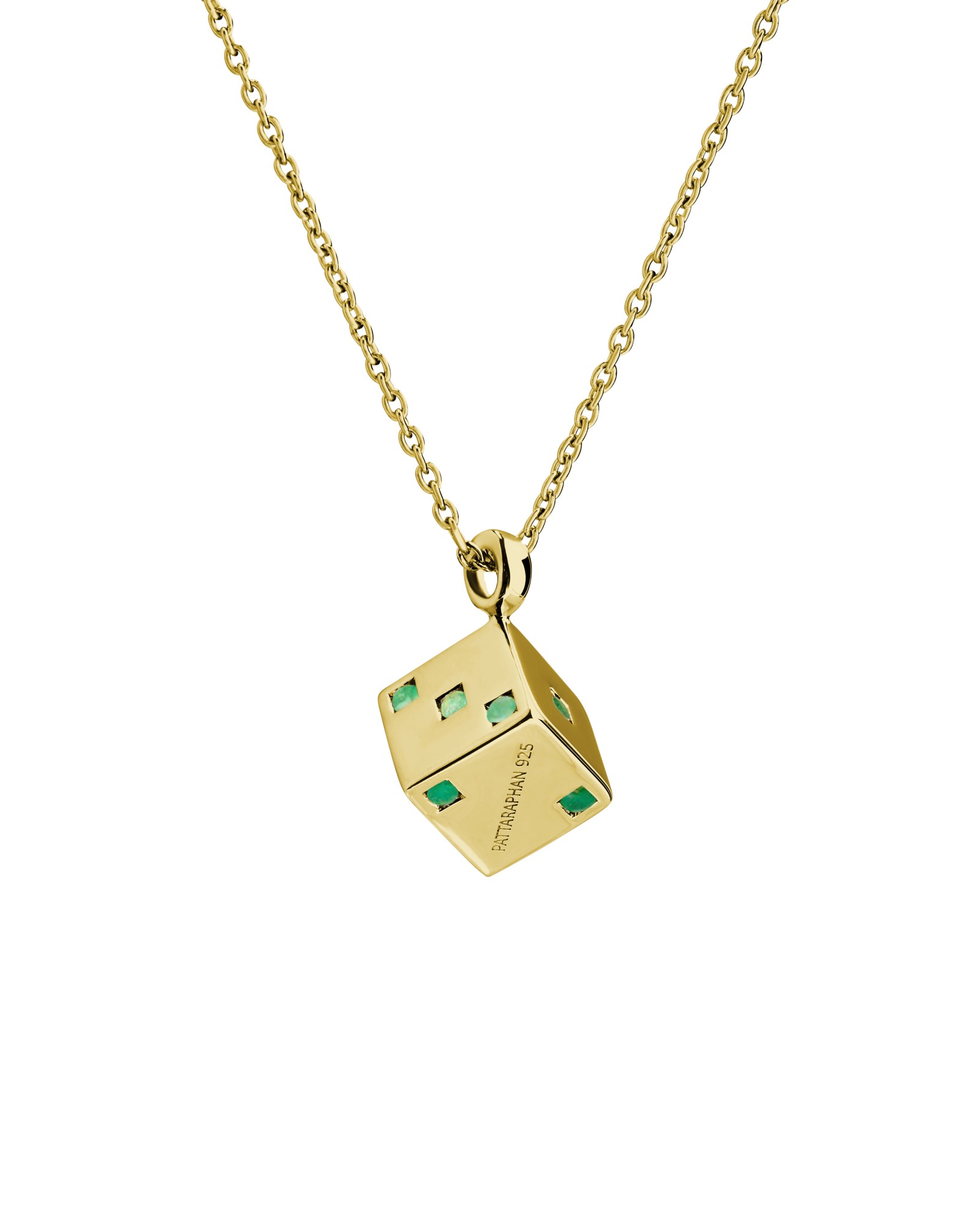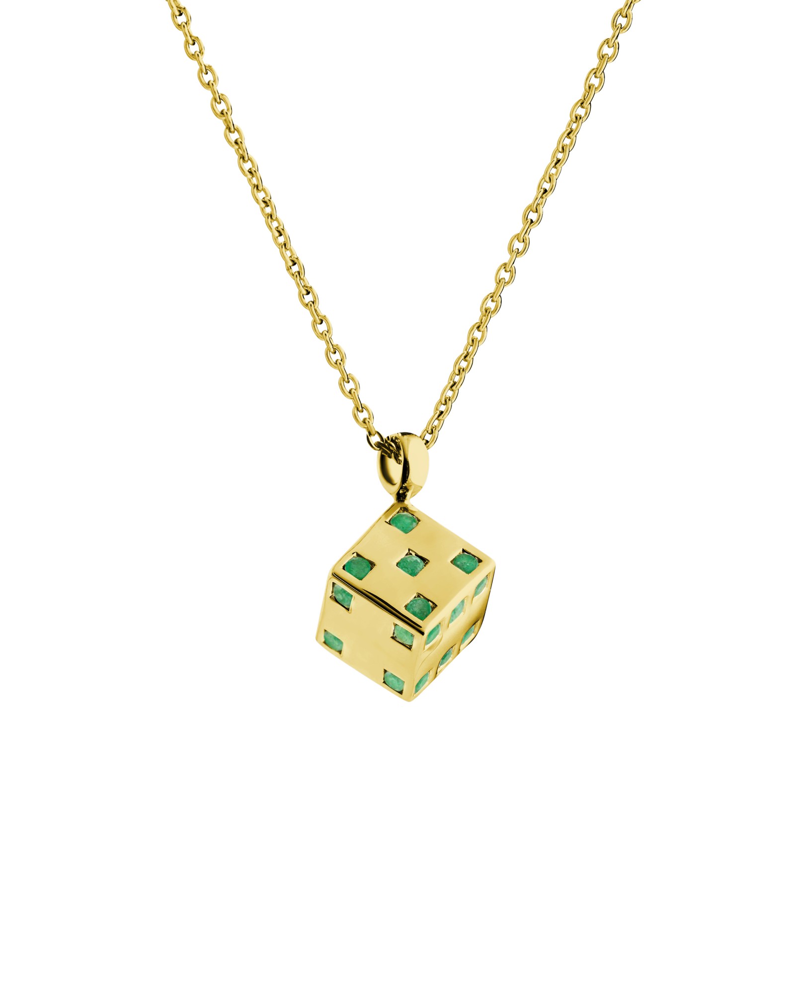 Solid dice pendant on a thin chain, featuring emeralds on all faces of the dice. Gemstones may vary in color.