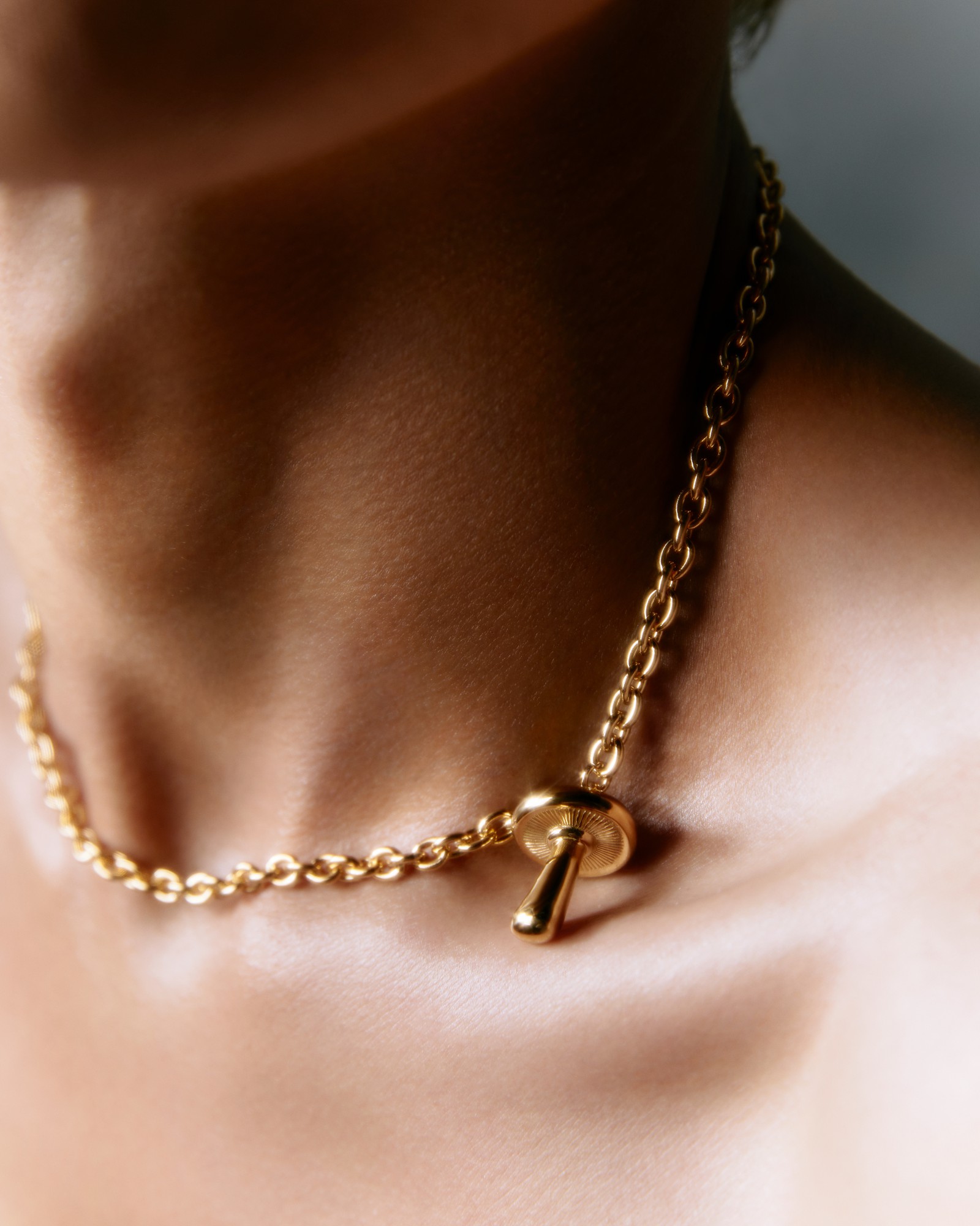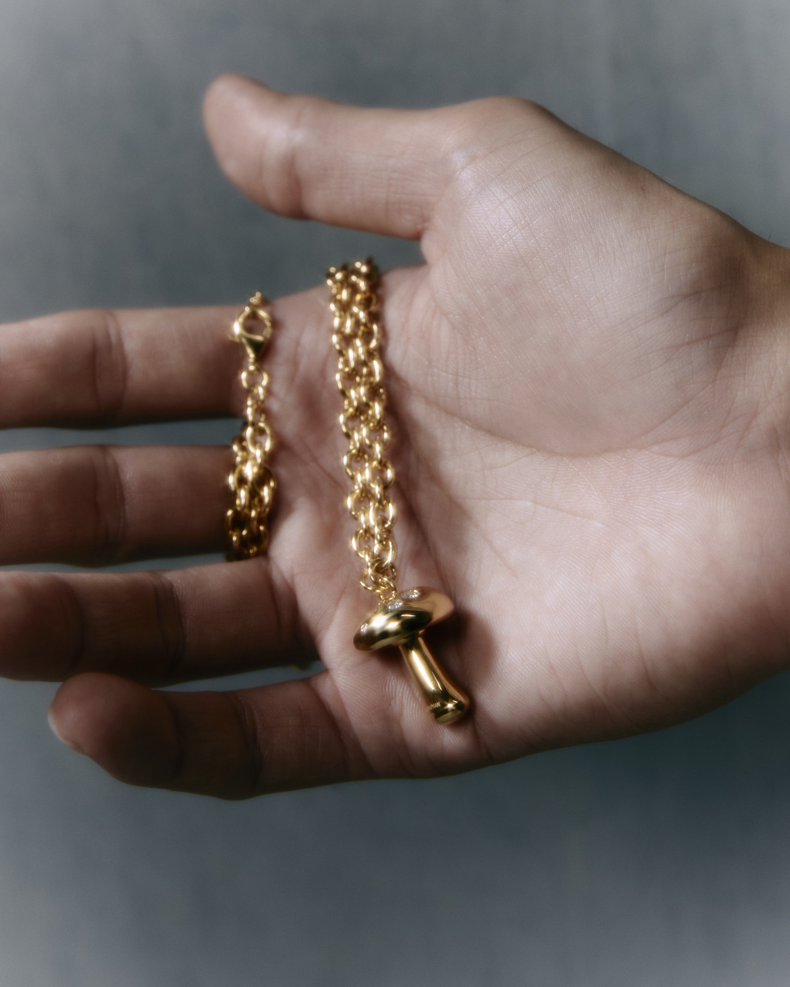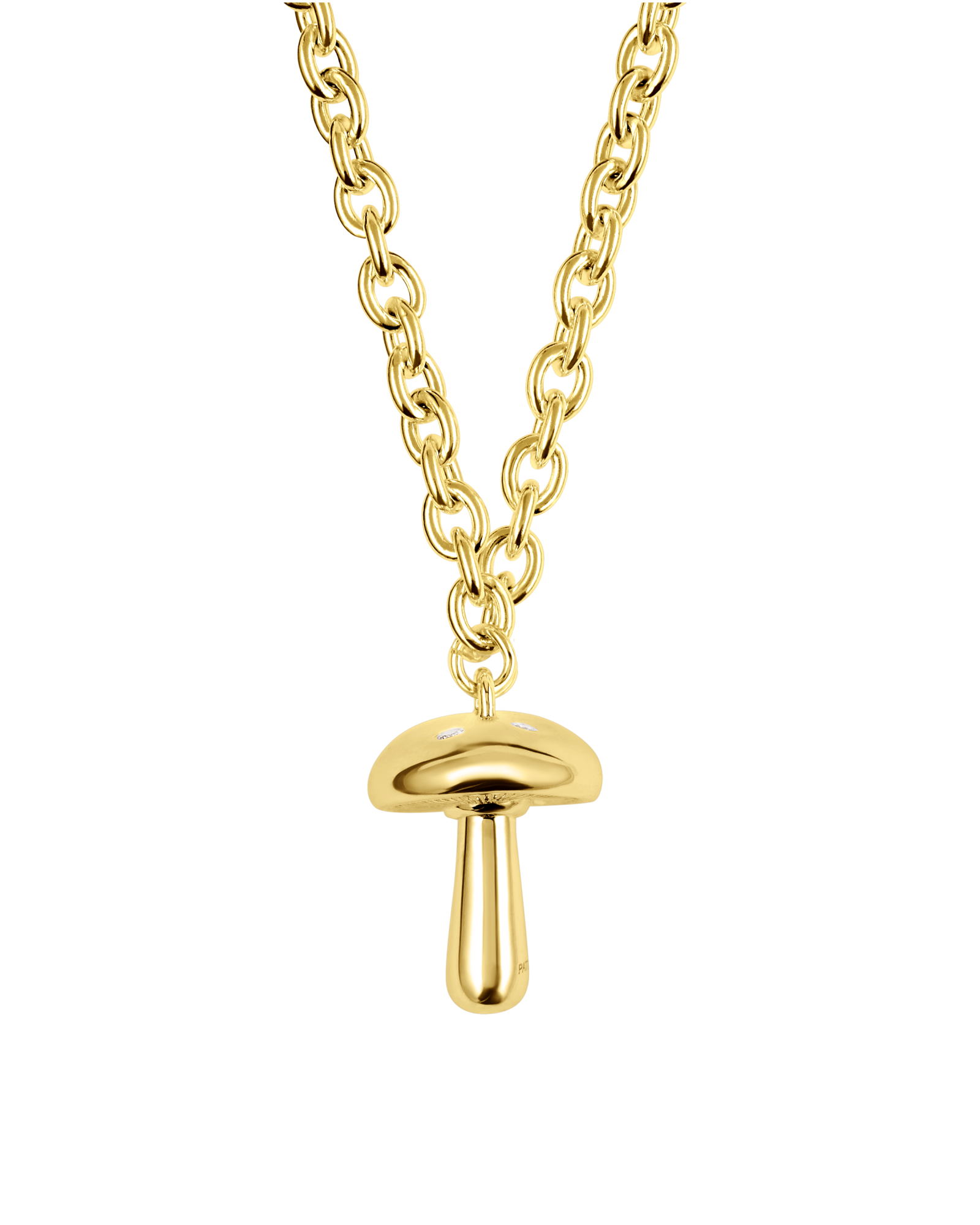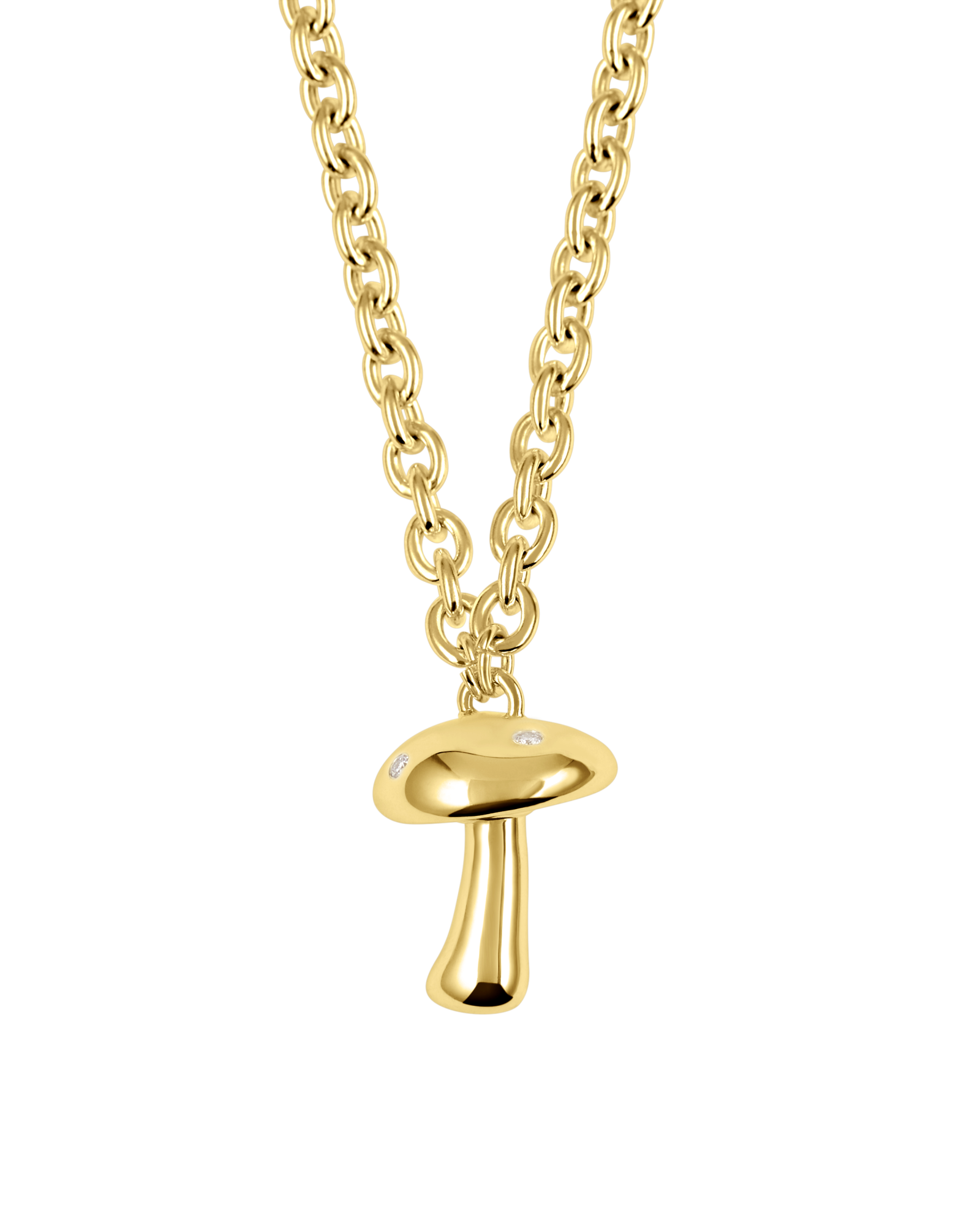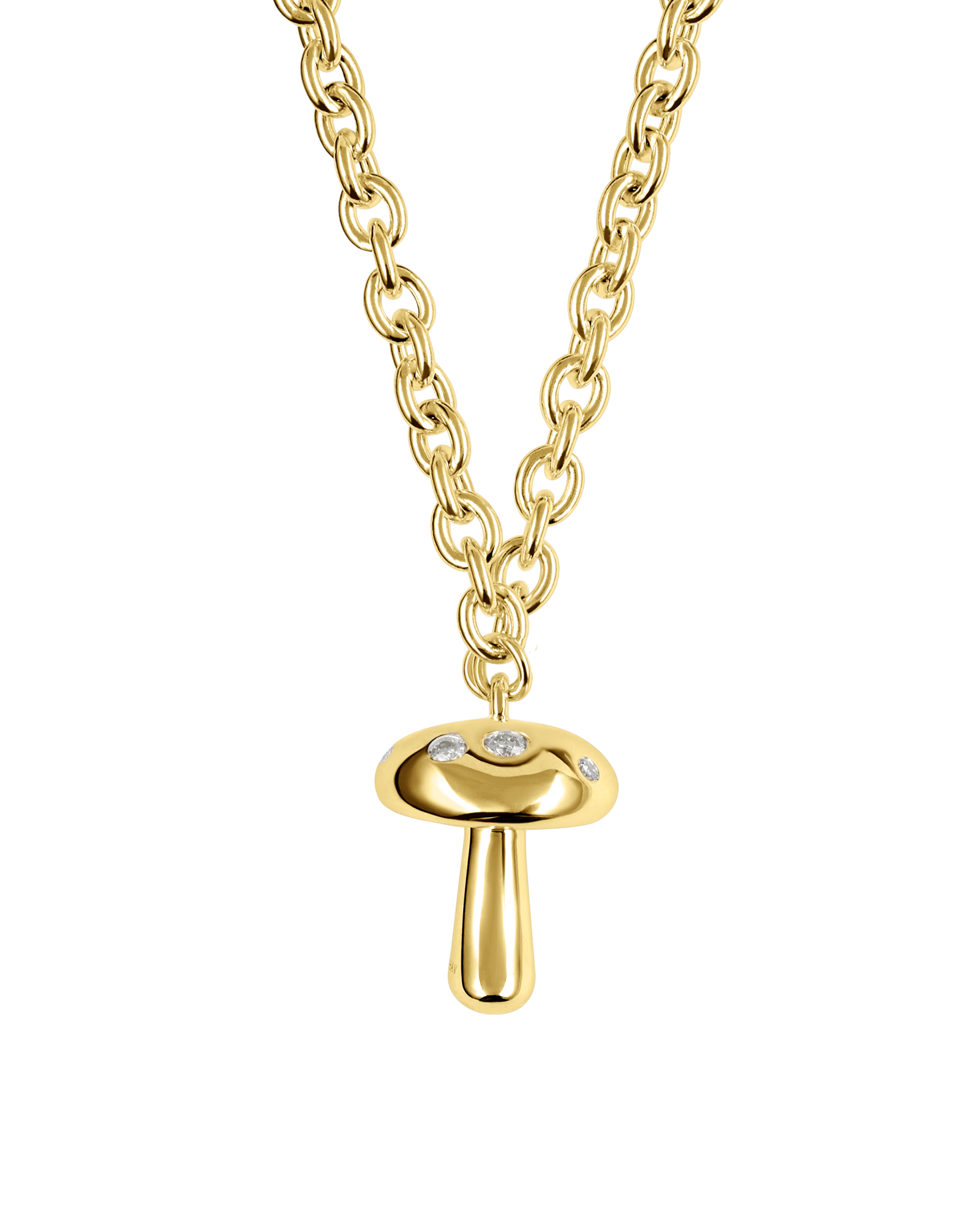 Chunky chain necklace featuring a chunky mushroom pendant with 6 diamonds set all around the top of the pendant.