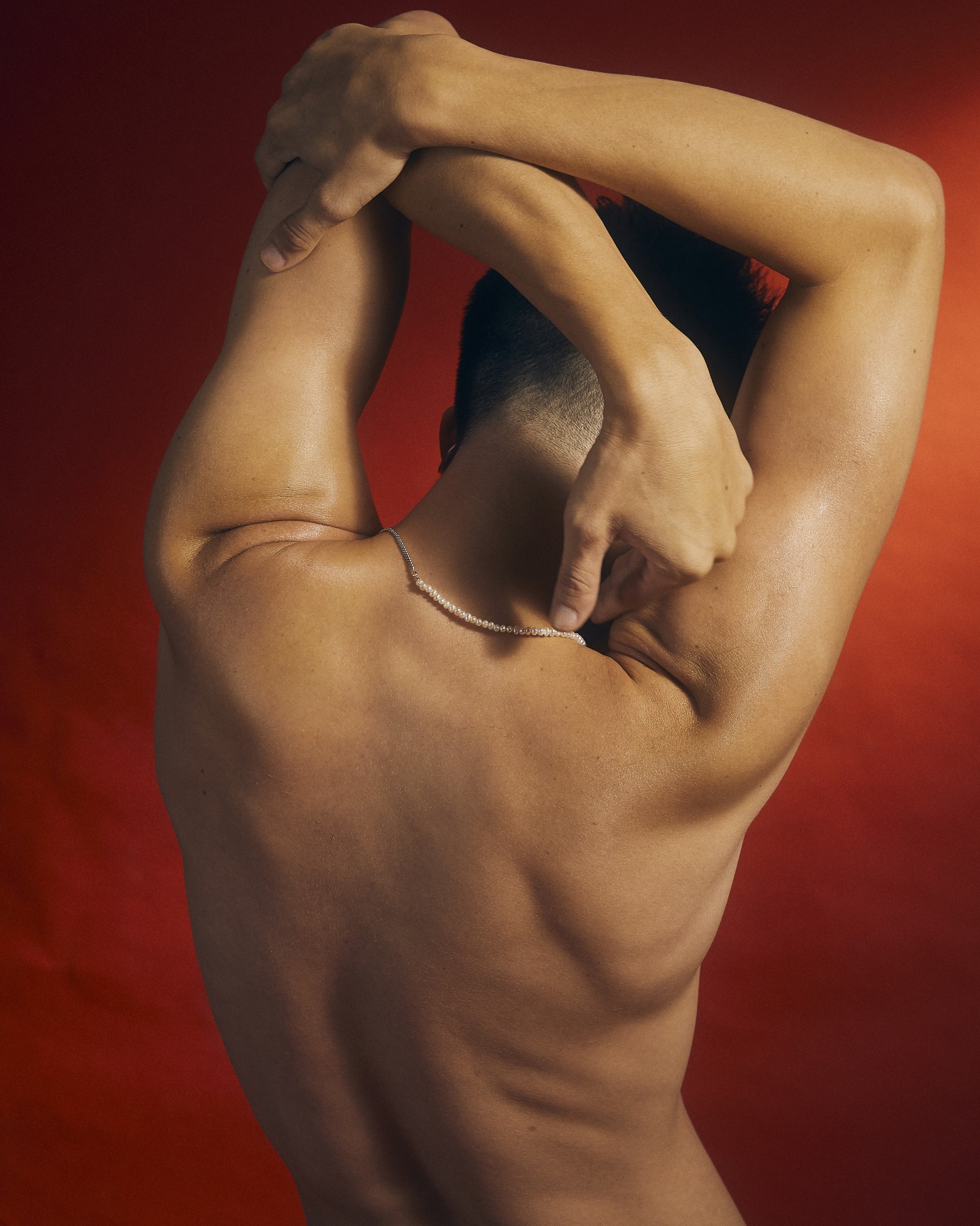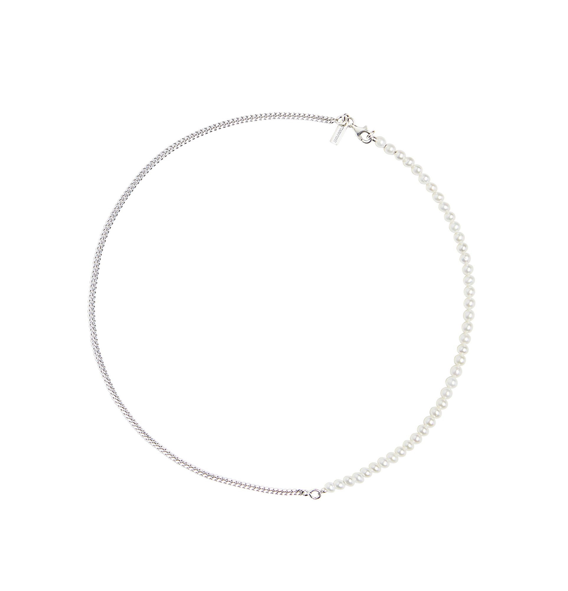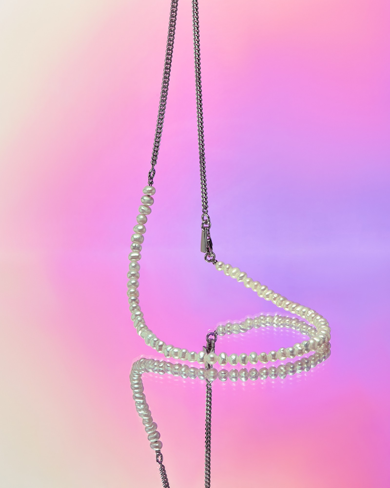 Materials: Rhodium plated sterling silver (silver) with 6″ of freshwater pearls