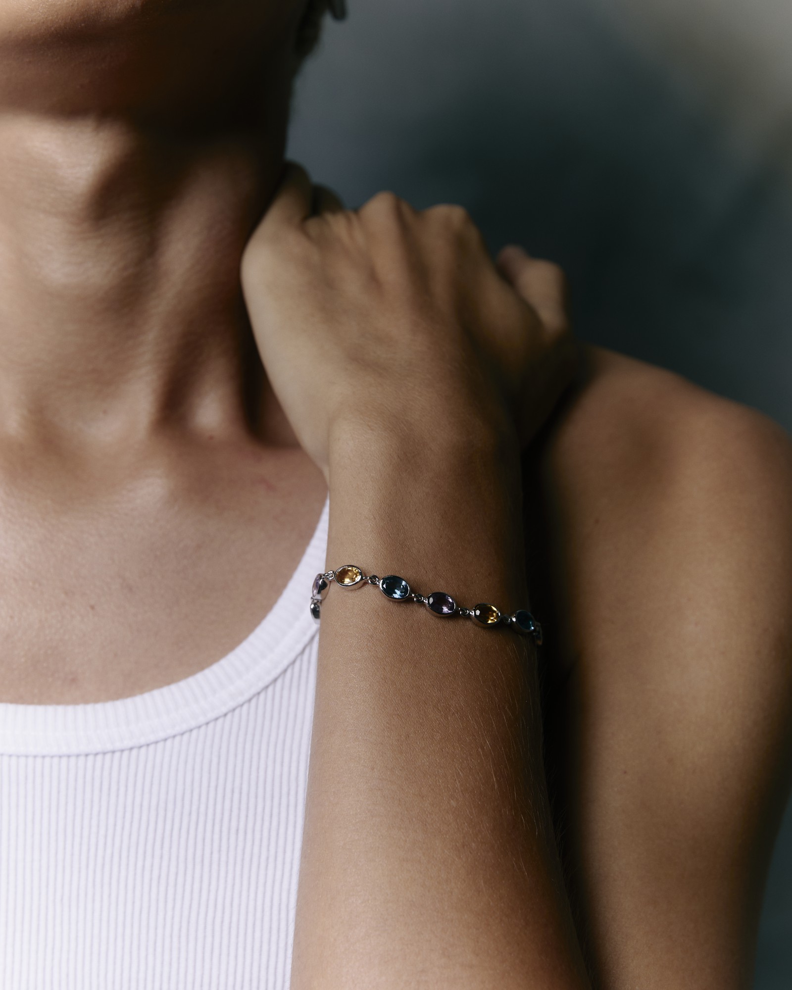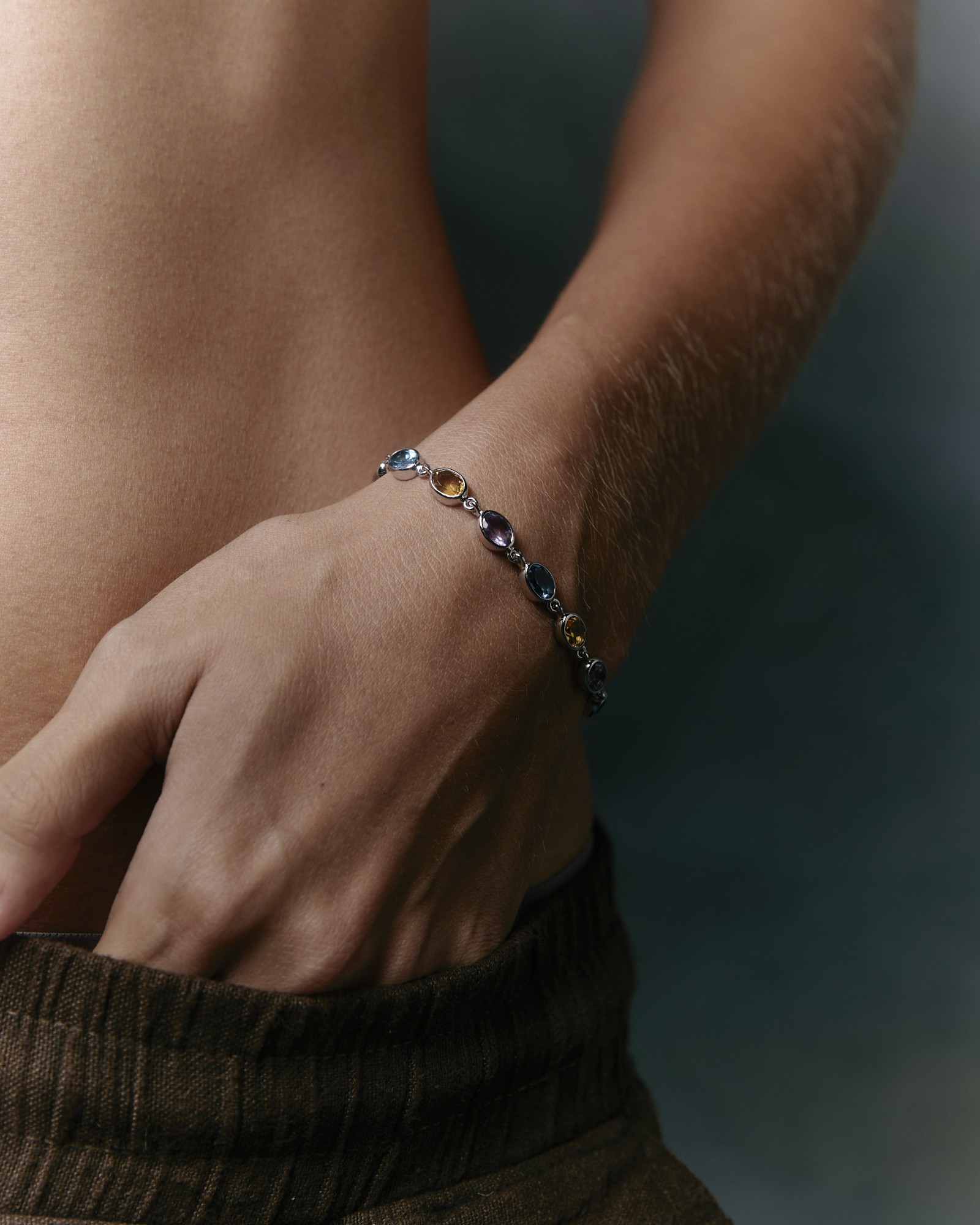 Traditional Thai bracelet, reimagined with a new perspective. Now available with a combination of stones that was inspired by the fleeting “blue hour.” Featuring African amethyst, citrine, and London Blue Topaz. Gemstones may vary in color.
